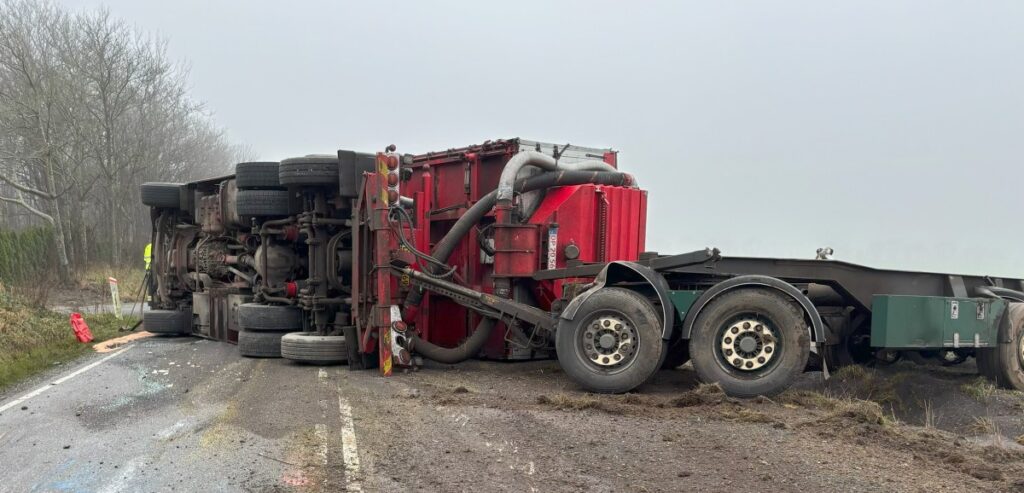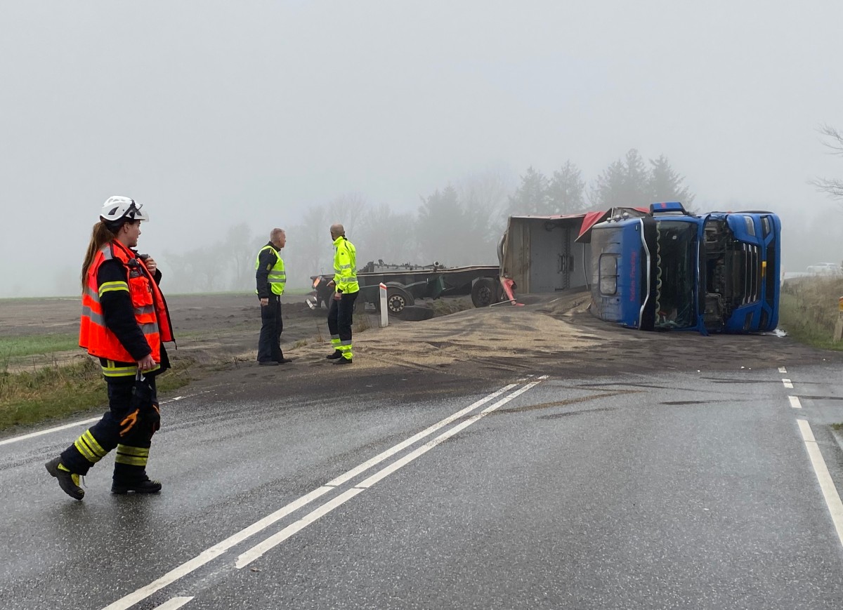 Uheldet skete ved 11-tiden, og for at rydde op på stedet skulle der både tilkaldes en stor bjærgningsvogn samt en fejemaskine, der kunne rense vejen for korn. I skrivende stund – onsdag middag – var der ikke nogen tidshorisont for, hvornår vejen atter kunne være farbar.