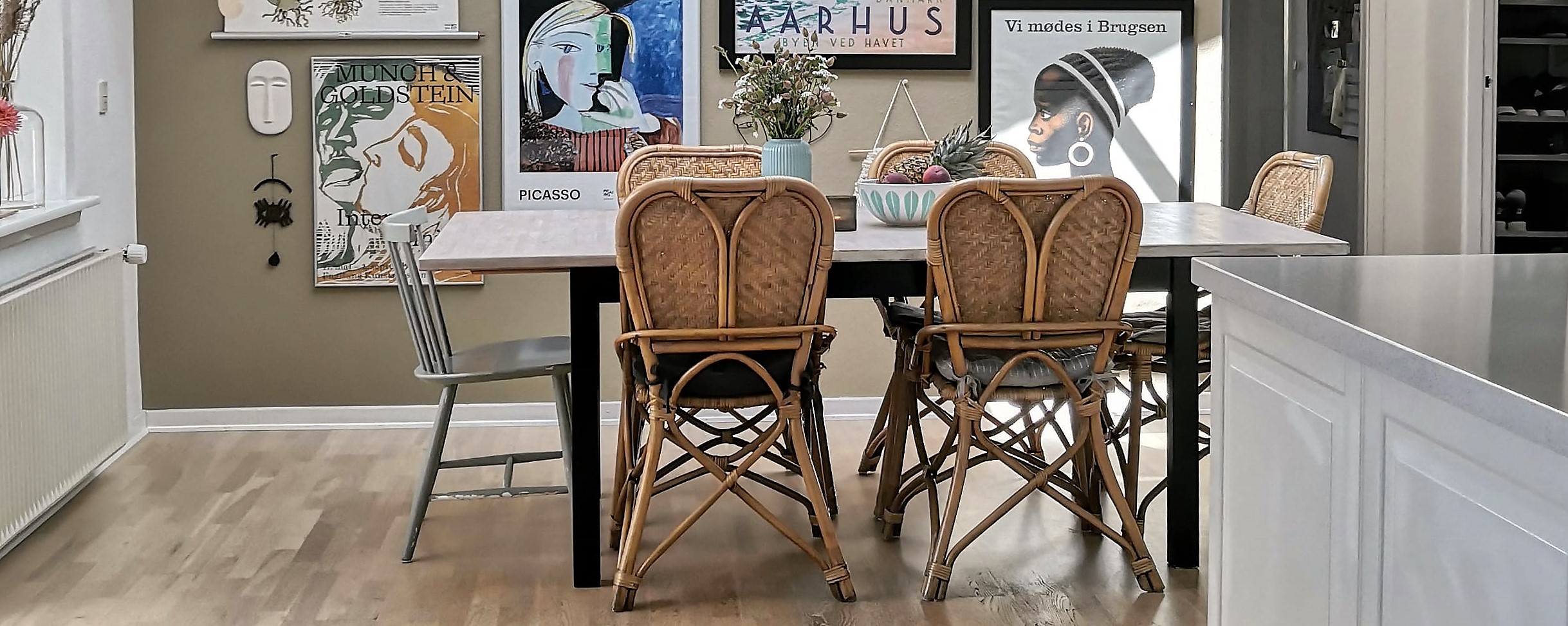 - Karina mestrer at finde møbler og genstande, som sammen giver en wauw-effekt. Se for eksempel spisestuen, hvor alle elementer er genbrug – lige fra lampe, stole og bord til de mange billeder på væggen. Som det fremgår af billederne, så er der også juleting – gamle genbrugseffekter og hjemmesyede kræmmerhuse