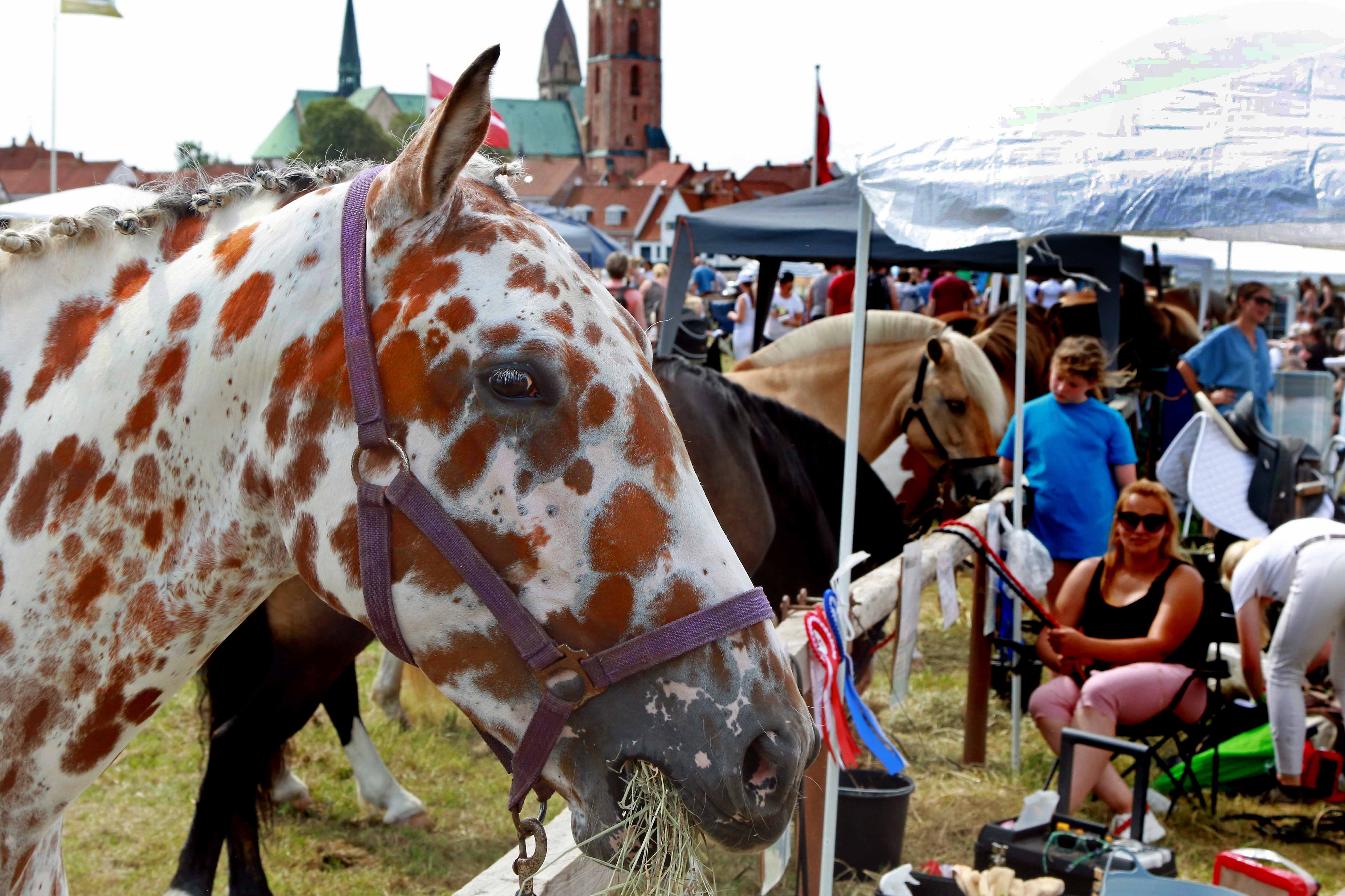 Se nu blot den firårige hvide Knapstrupper med brune pletter: MAGIC SPOT ON, som Kit Stryhn, fra Esbjerg havde med på Ribe Dyrskuet. Hun fortalte: ”Min hest klarer støjen og uroen på pladsen uden at vise tegn på nervøsitet.” Og så blev den dog nysgerrig, da den opdagede kameraet, som klikkede.