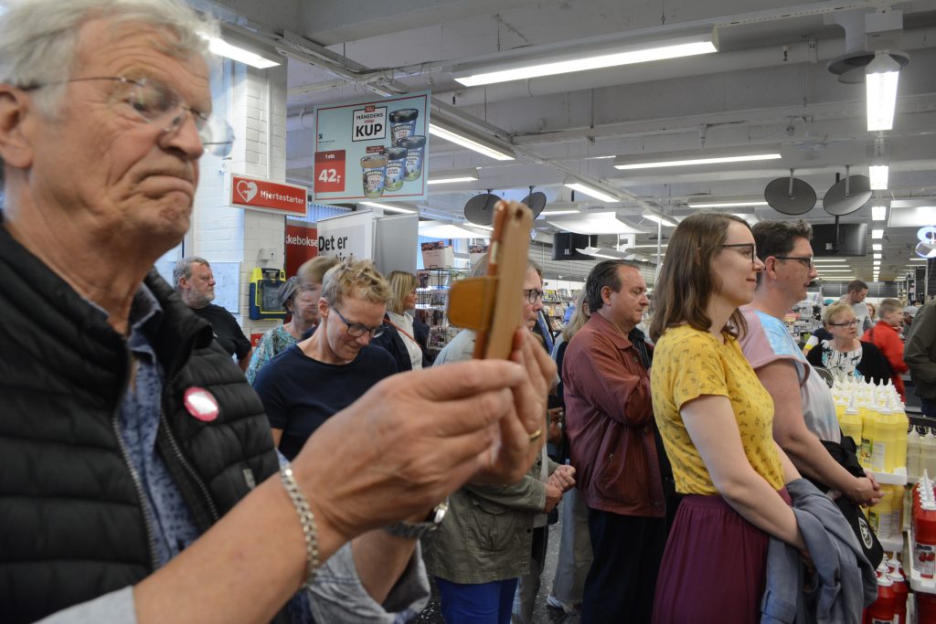Og som afslutning på duetten hentede Palle Knudsen spontant en indkøbsvogn, placerede Beate Mordal i den og kørte til publikums store jubel ind i supermarkedet for at handle ind.