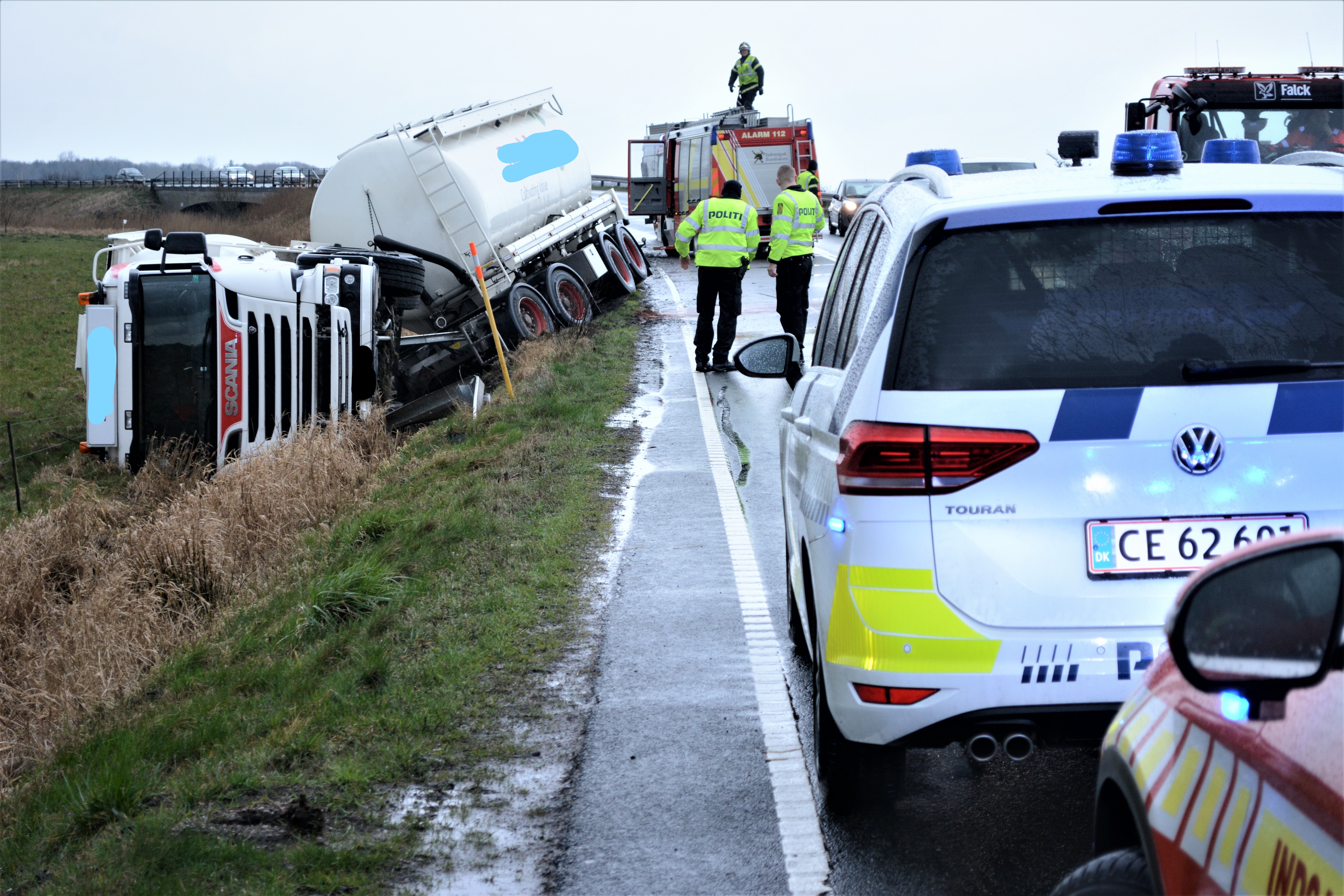 Forvognen lagde sig på siden i grøften, mens anhængeren blev stående.