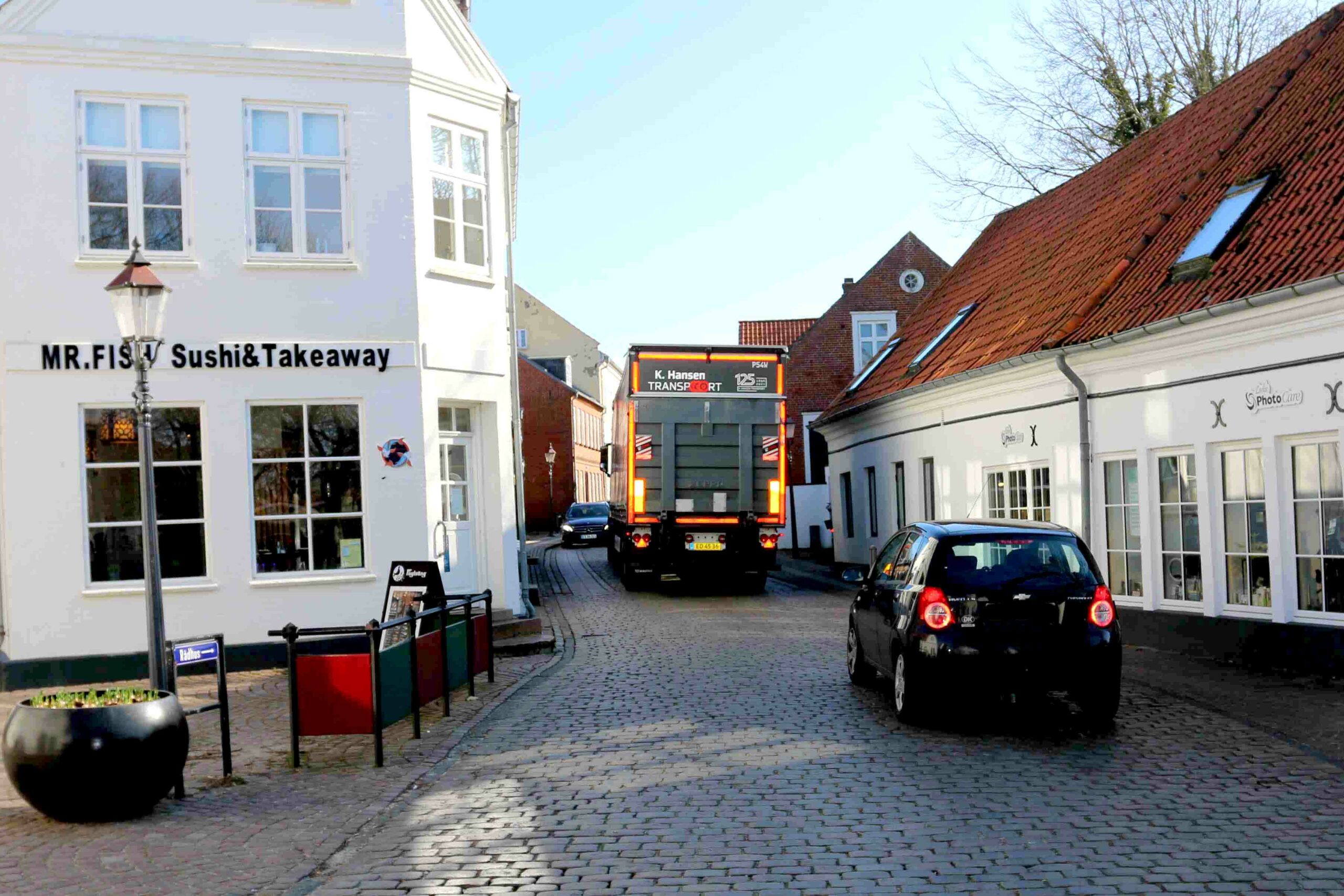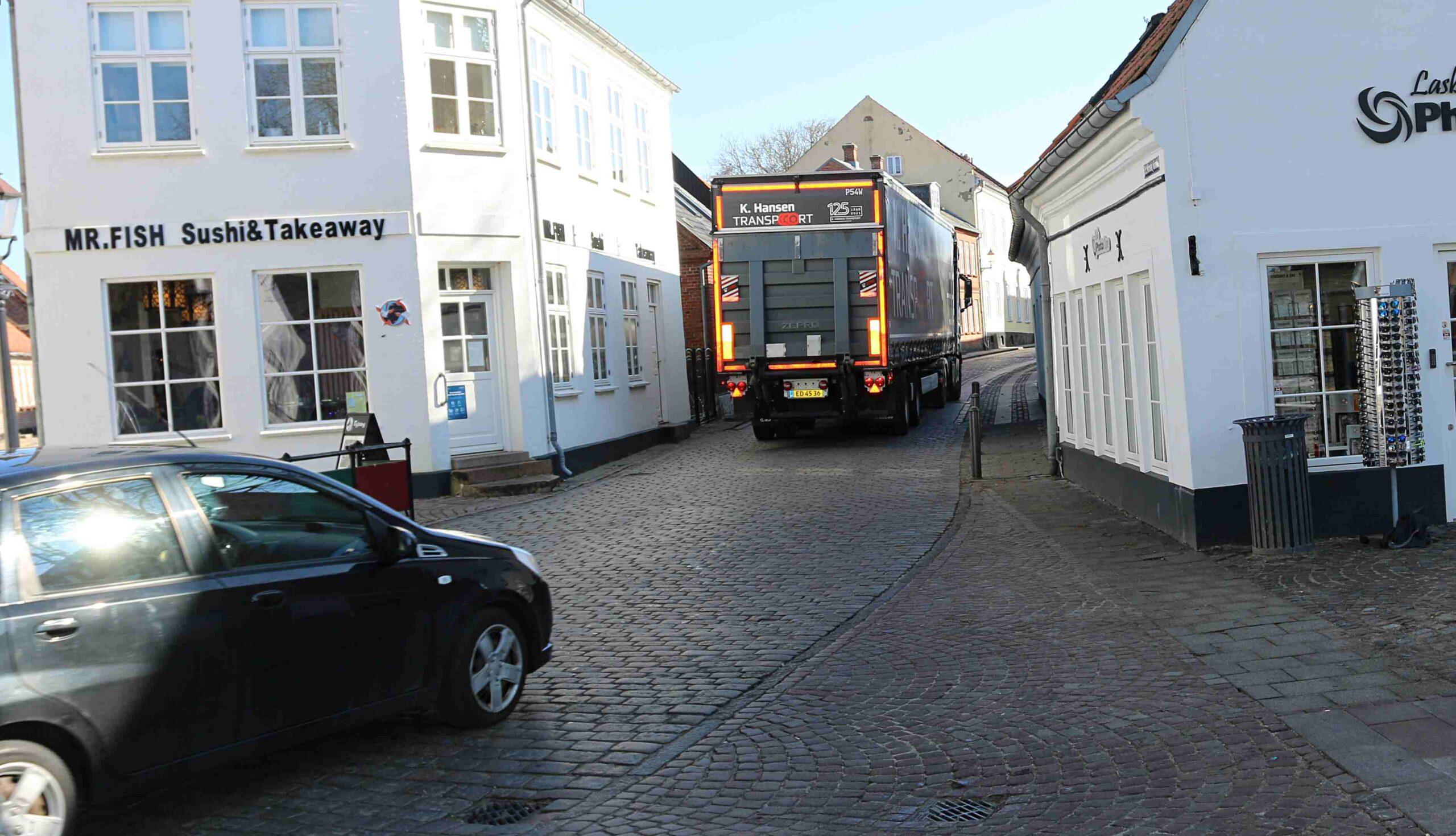 I tidligere artikler har vi beskrevet, hvordan kloaksepareringen vil foregå i Saltgade, Tvedgade og Sct. Nikolaj Gade – og der vil opstå situationer, som den torsdag eftermiddag. Måske er det en god idé at tilbyde vognmænd en parkeringsmulighed med deres store vogntog uden for området – og en løsning, hvor varerne bliver kørt frem til modtagerne i mindre køretøjer.