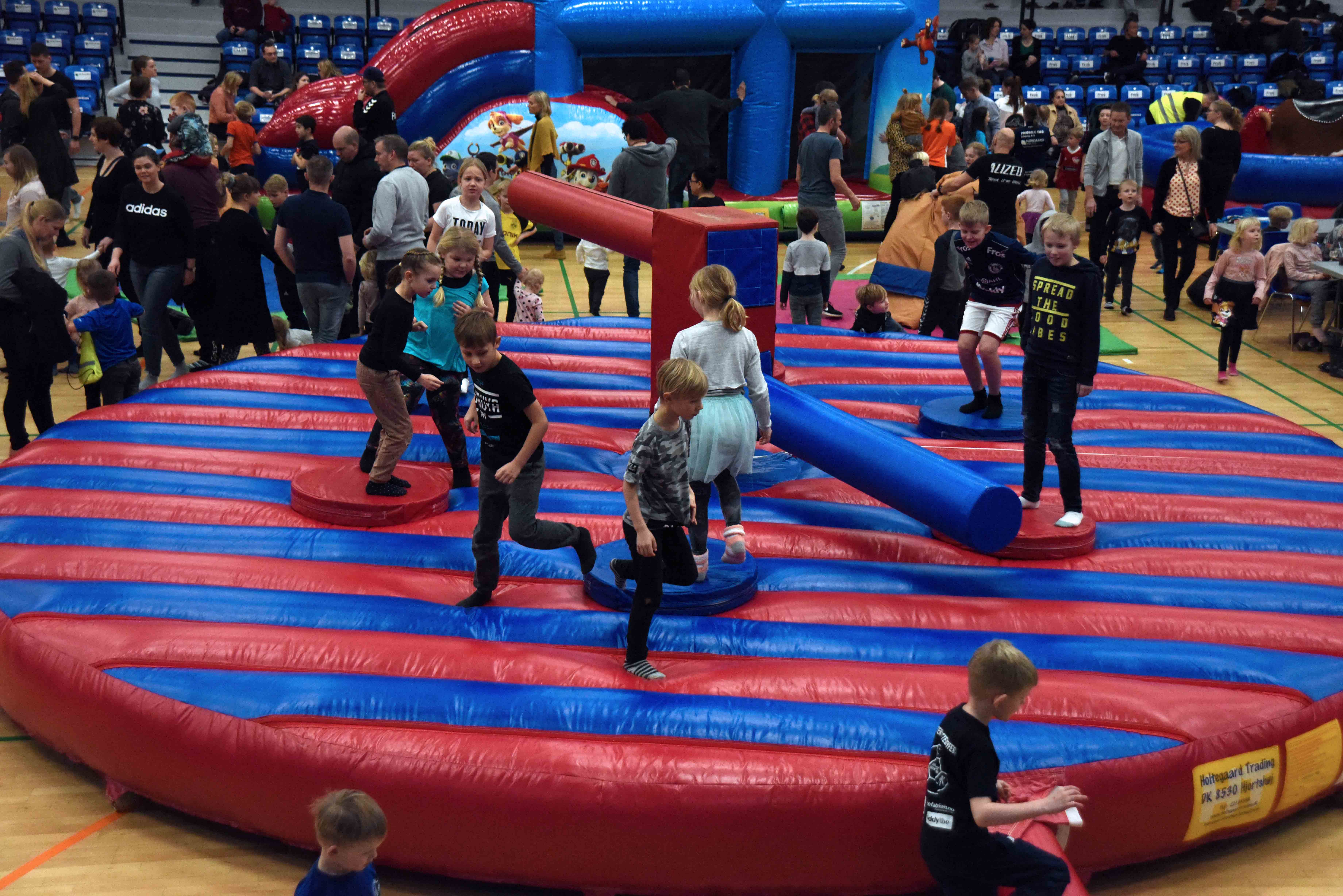 Der var fem forskellige hoppeborge – lidt forskellige i opbygning i forhold til alder, rutsjebaner, forhindringsbane og sumobrydning i oppustelige dragter. En tur i wipeout sweeperen fik smilene frem blandt tilskuerne, når enkelte af børnene ikke lige nåede at dukke sig eller hoppe over. Der var også nogle børn, der lige måtte en tur ud til forældrene eller bedsteforældre for at få lidt trøst, når en af de ”blå arme” lige havde pandet dem ned i kanvassen. At dukke sig og hoppe over de drejende arme krævede lidt overblik, men sjovt så det ud.