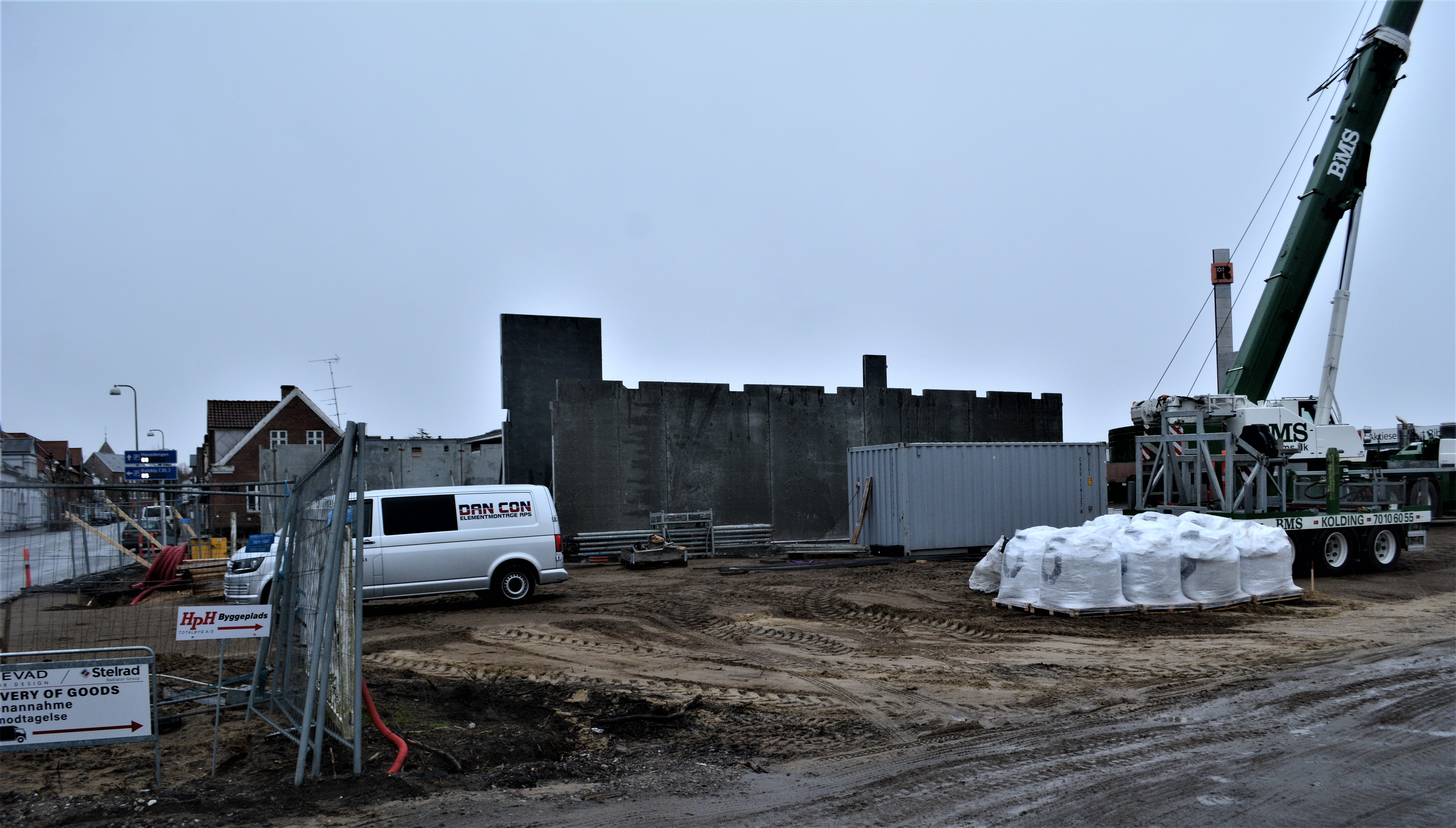 En stor kran fra BMS løftede de store elementer på plads på soklen, og der vil ikke gå mange dage, før man for alvor kan begynde at se konturerne af den nye forretning. Dermed er det første fysiske skridt taget til det, der skal blive et helt nyt bykvarter i gamle Ribe.