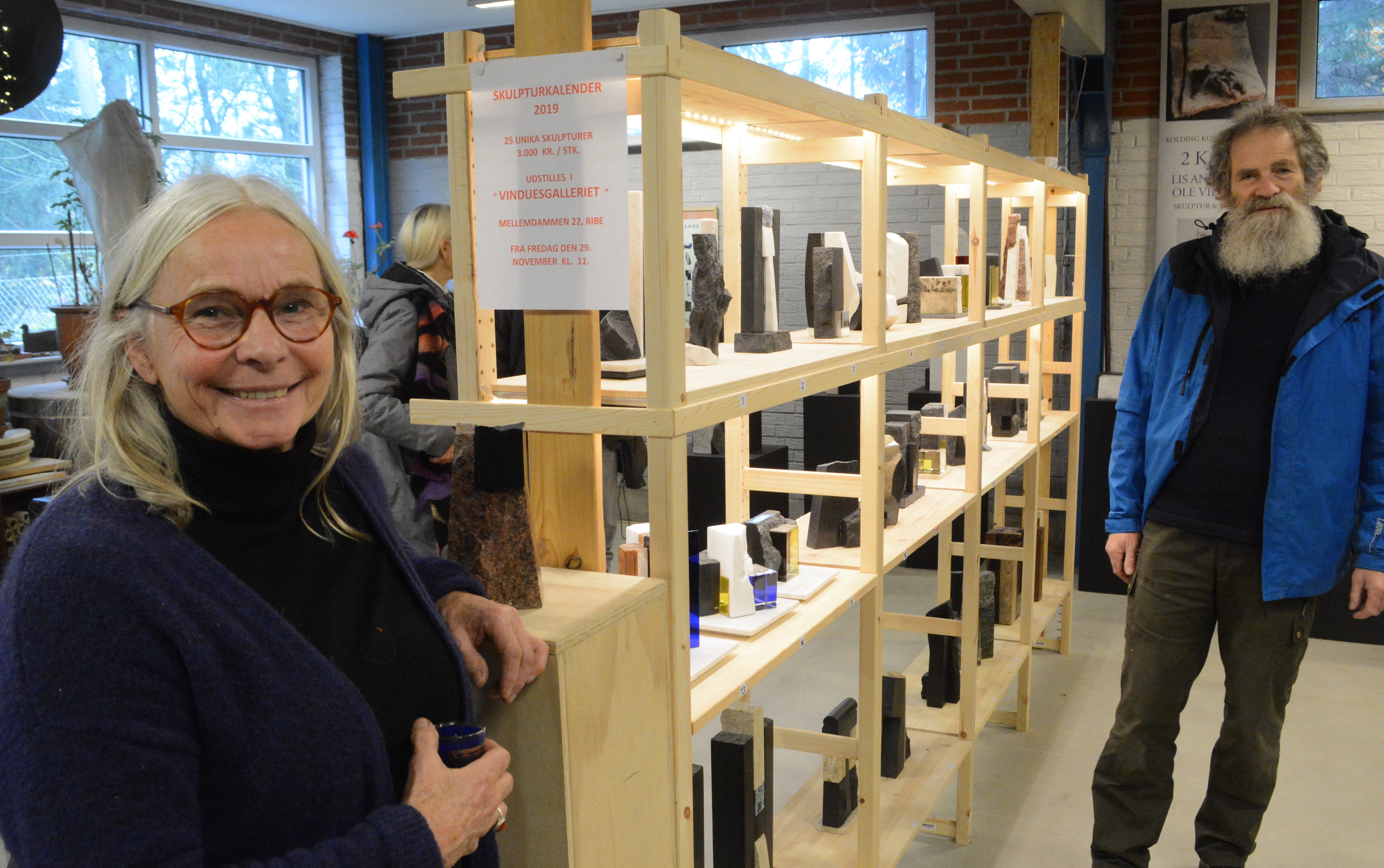 Lis Andersen præsenterer til gengæld sin traditionelle skulpturkalender på en anderledes måde end tidligere år. De 24 skulpturer præsenteres nemlig på en fritstående reol, så skulpturerne kan ses både forfra og bagfra – hvis man ellers kan tale om en forside og en bagside i den forbindelse. For Lis Andersens skulpturer tager sig lige godt ud set fr alle sider.