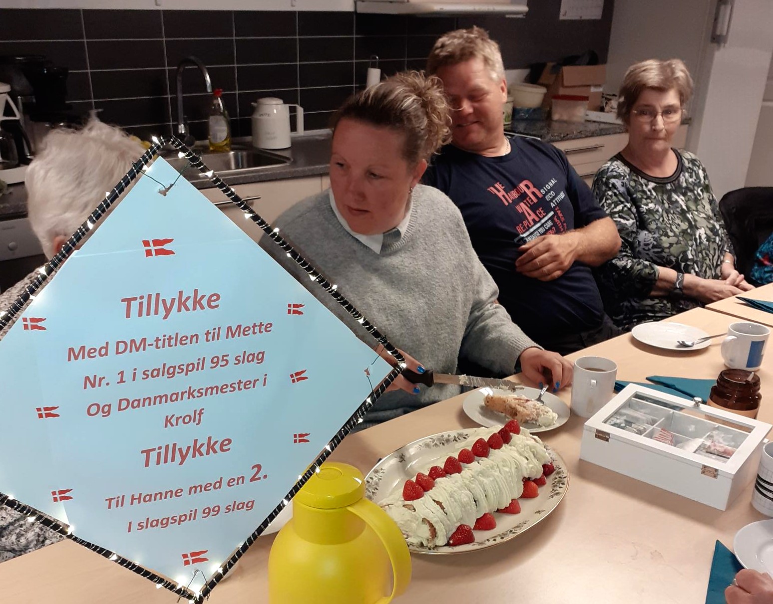 Mette Juul blev onsdag aften fejret ved klubaftenen i Lundsmark. Der var lagt rød løber ud, ligesom der var stort velkomstbanner. Og der blev budt på kaffe og kage efter en runde krolf. 48 ud af klubbens 55 medlemmer ar mødt op.