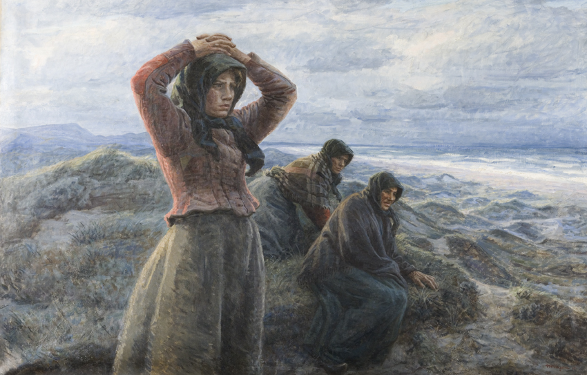Værket har med sine 121,5 x 187 cm en monumental størrelse, og motivet er dramatisk. I klitterne ved havet ses tre kvinder med alvoren prentet i ansigtet. Bag dem har skyerne trukket sig faretruende sammen, og der er skum på bølgetoppene. Selv hvis værkets titel ikke var os bekendt, ville vi ud fra kvindernes mimik og gestik kunne tyde billedet – der sker noget uden for billedrammen, som er farligt. Måske er det deres kære, der er i nød?
