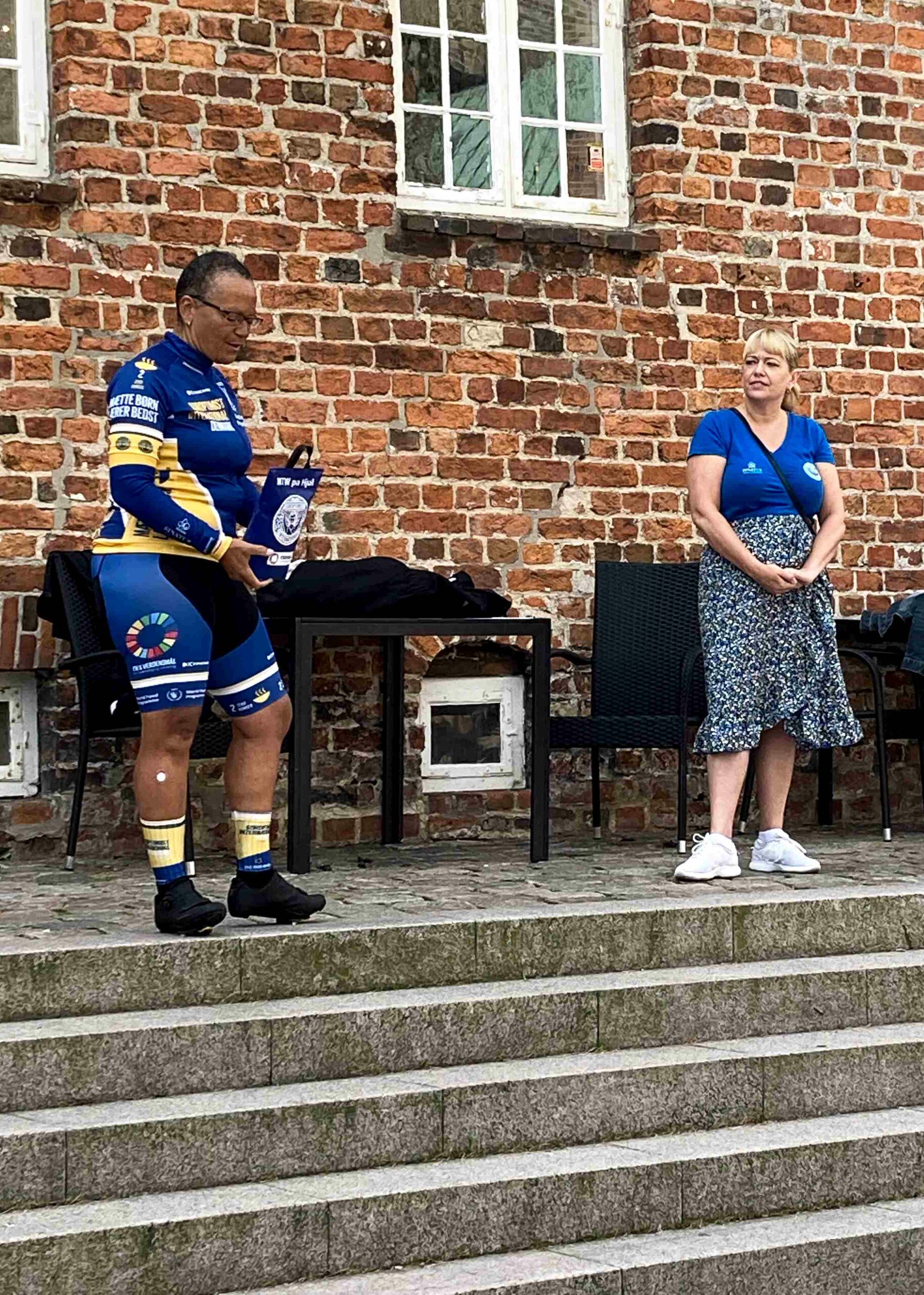 Lørdag formiddag rullede en mindre gruppe blåklædte cyklister med orange sider ind på domkirkepladsen, hvor de lokale sorooptimister tog imod med bannere. Annette Brøchner Lindgaard fra Sorooptimistklubben i Ribe fortæller, at eventen markerer klubbernes deltagelse i Stop Sult Fonden og FN´s World Food Programme´s indsamling til fordel for skolemad og skolegang i Burkina Faso.