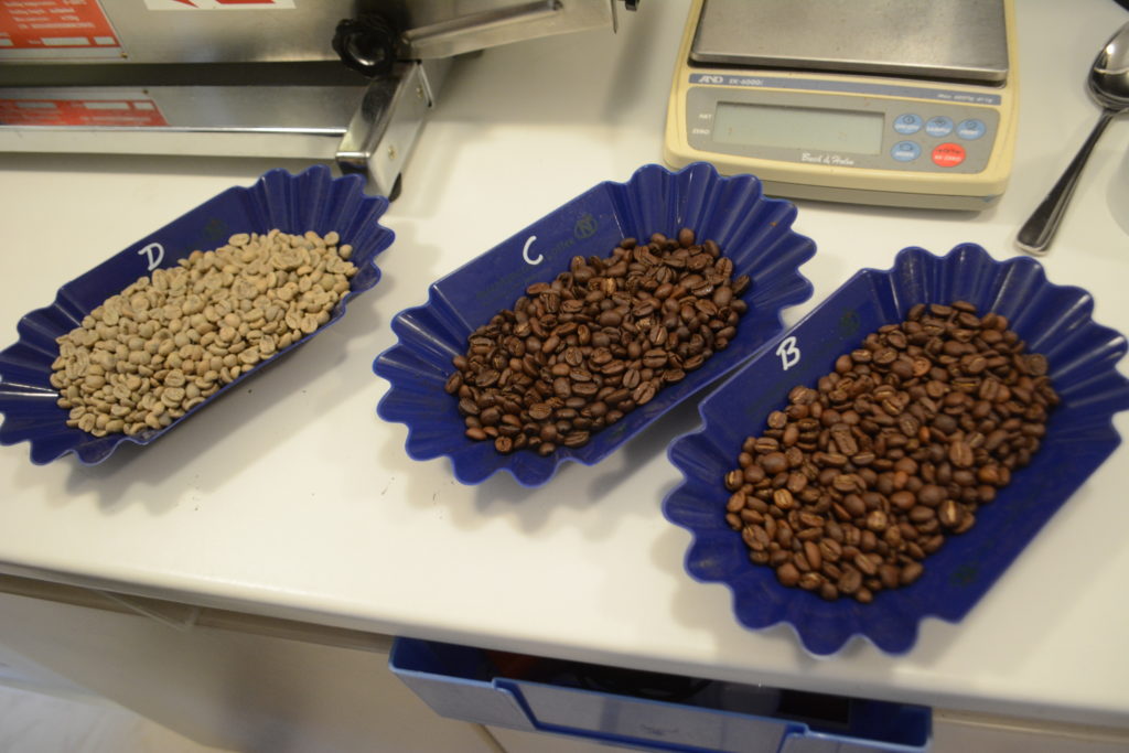 Til venstre de ubrændte, grønne bønner, hvis duft minder meget om hø. I de to skåle til højre er der en lys ristet og en mærk ristet bønne.