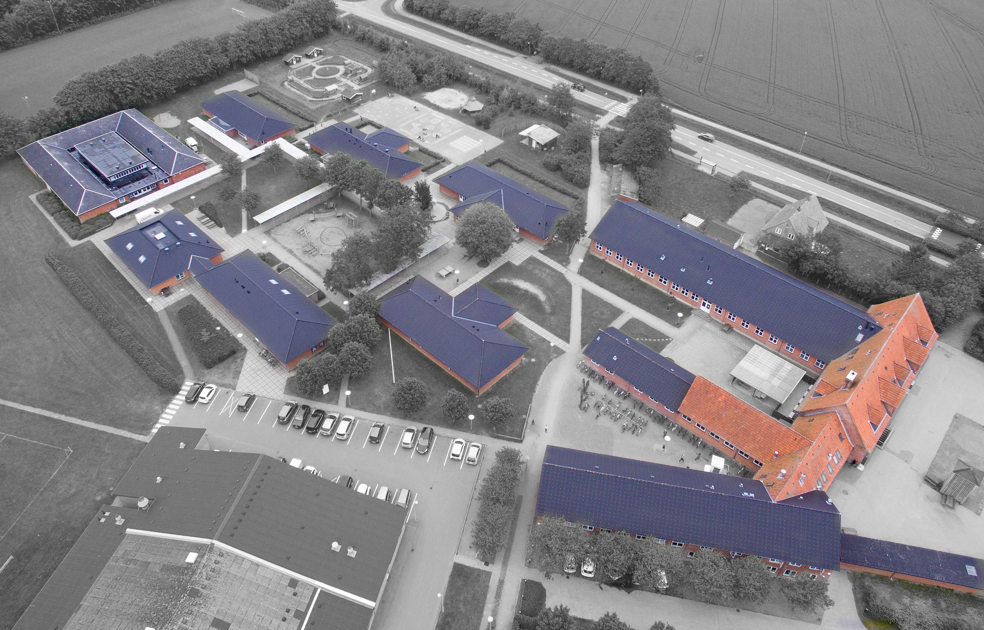 Gredstedbro Skole med Kongeåhallen nederst i billedet – der savner sammenhæng med fælles ankomst plads, påpeger Mellembyplanen