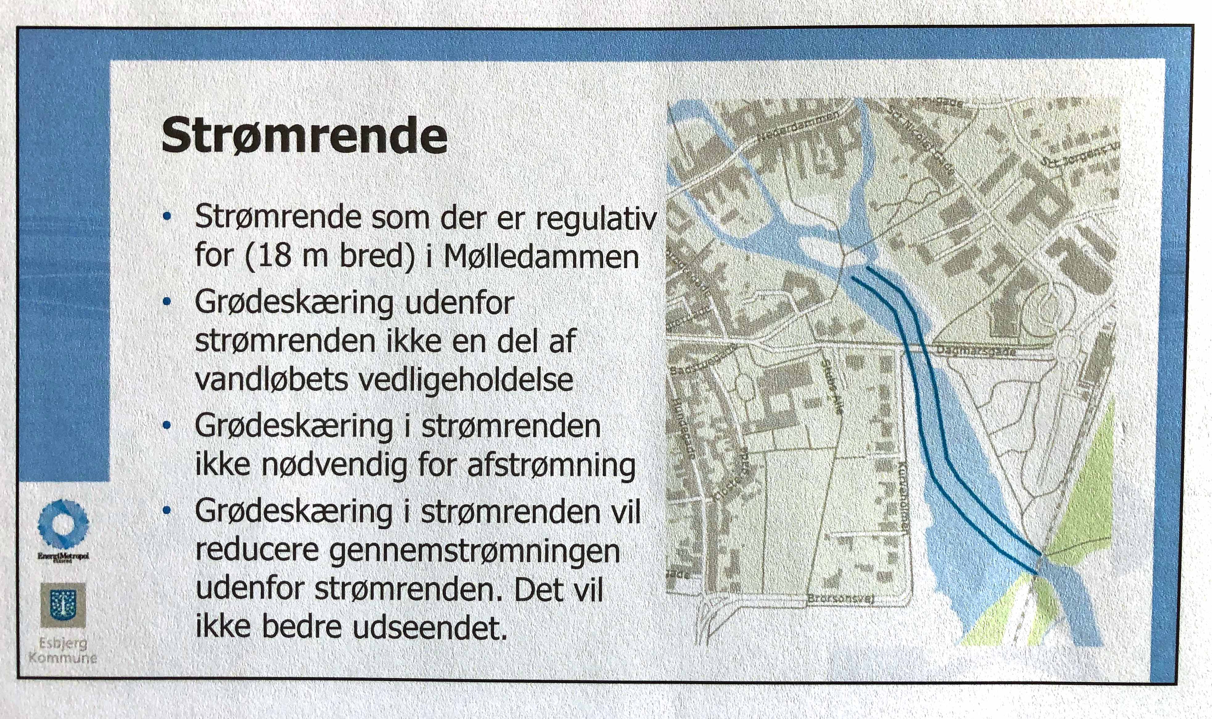 På en af plancherne viste miljøchefen, hvordan vandløbet bugter sig gennem Mølledammen – og Esbjerg Kommune vurderer, da vandløbet er 18 meter bredt, at regulativet for pasning af vandløbet er opfyldt. Der er ikke behov for at skære i strømrenden. Og så skal plantevæksten i den øvrige del af Mølledammen danne ophold for bla. snæblens smolt.