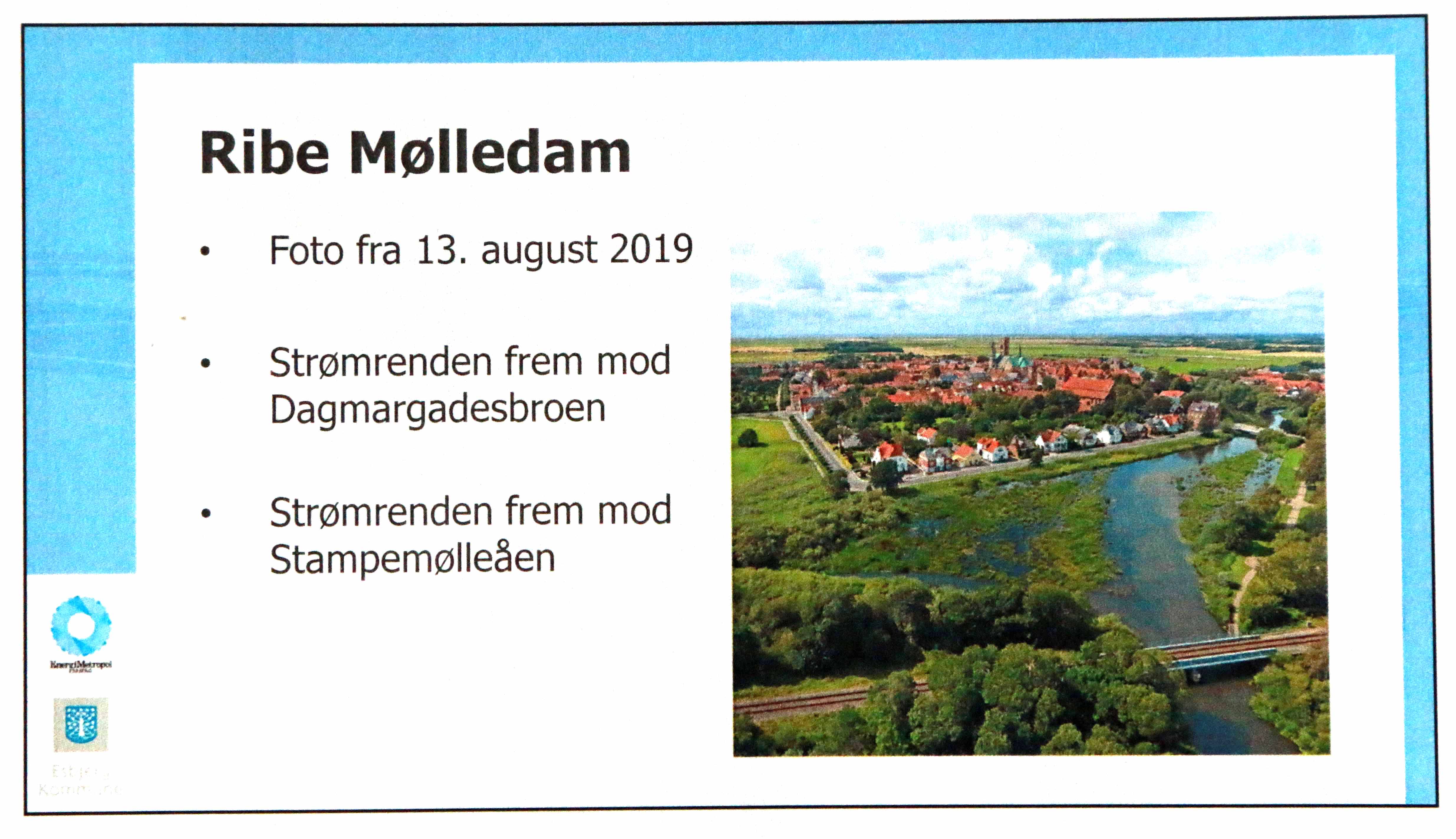 På en af plancherne viste miljøchefen, hvordan vandløbet bugter sig gennem Mølledammen – og Esbjerg Kommune vurderer, da vandløbet er 18 meter bredt, at regulativet for pasning af vandløbet er opfyldt. Der er ikke behov for at skære i strømrenden. Og så skal plantevæksten i den øvrige del af Mølledammen danne ophold for bla. snæblens smolt.