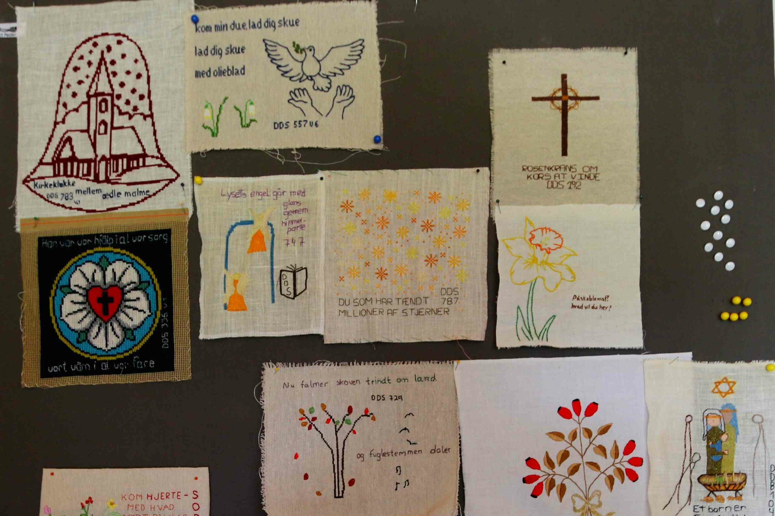 Hver anden tirsdag eftermiddag mødes en række kvinder med sognepræst Therese Solten for at dykke ned i salmernes univers samtidig med, at der broderes. – Der er plads til flere på holdet, fortæller Therese, da RYK IND RIBE ser forbi – og kan beundre de mange små værker, som er blevet skabt. Hvert billede er inspireret af et salmevers, frit efter association og kreative indfald. Målet er at skabe et tæppe, som kan udstilles i pastoratets kirker.