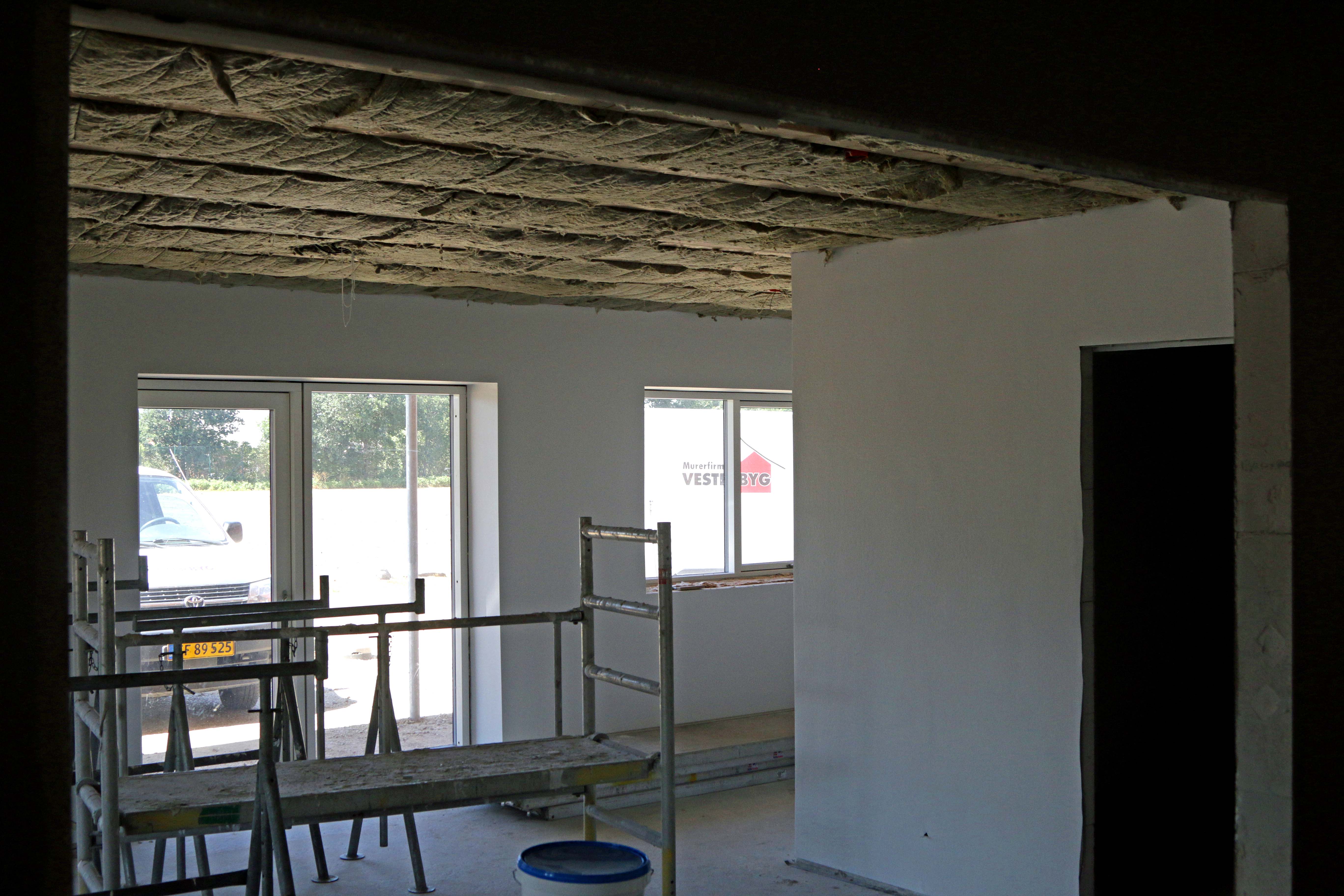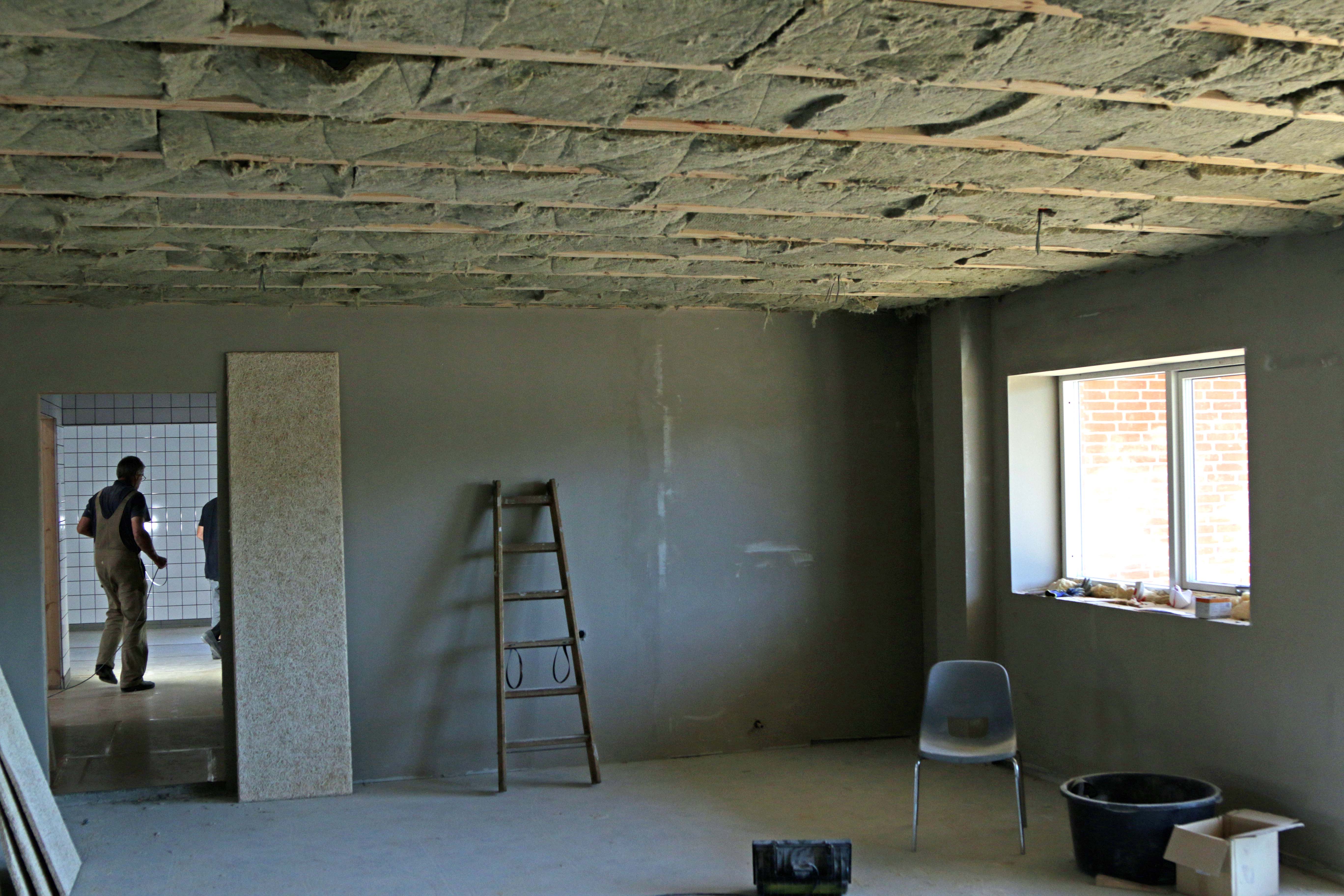 Indenfor er væggene blevet pudset – og isoleringen på lofterne er på plads. Nu venter så opsætning af mange, mange troldtekt plader.