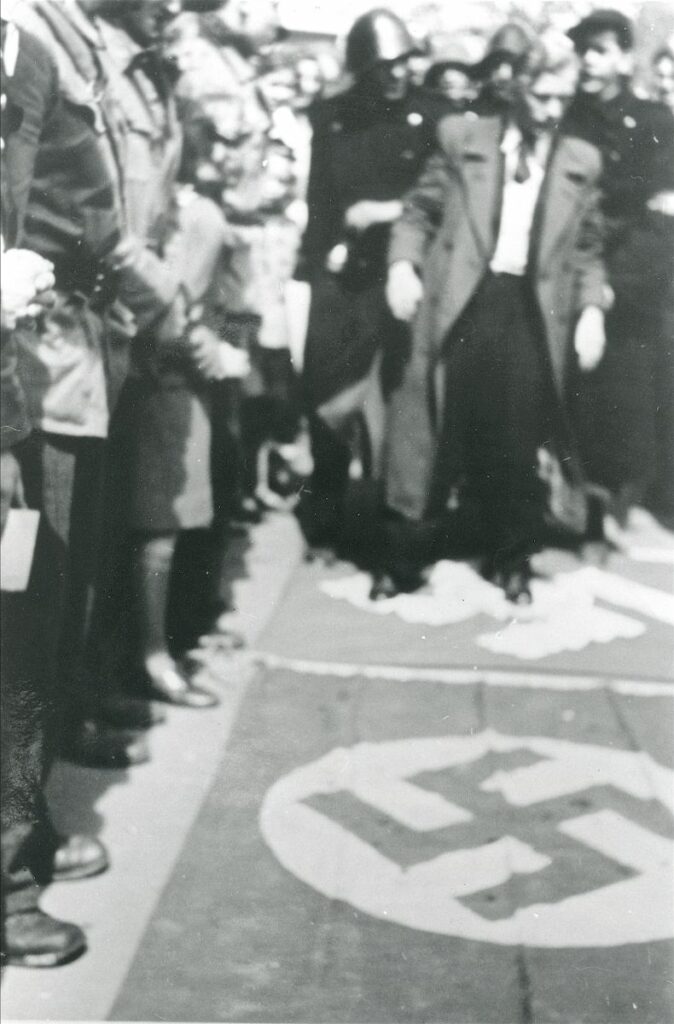 Arrestanter, der var mistænkt for landsforræderi, blev bl.a. anbragt på Carlsberg i København, hvor de symbolsk skulle træde på hagekorsflag. Maj 1945. Foto fra Frihedsmuseet.