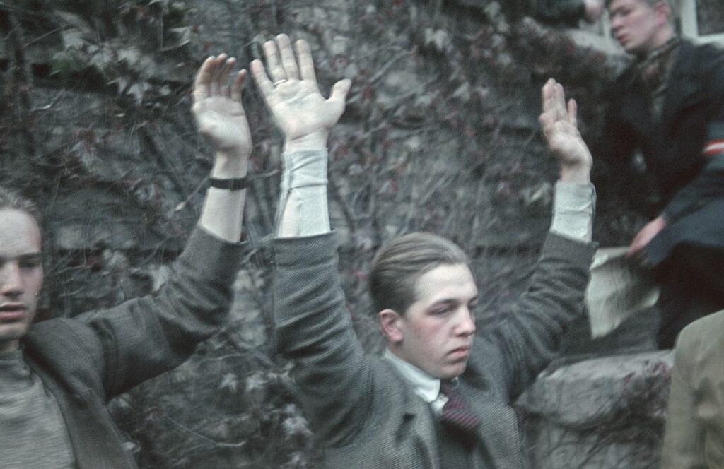 Unge mænd arresteret for landsforræderi. Bevogtes af ligeledes ung modstandsmand. København, maj 1945. Foto fra Frihedsmuseet.