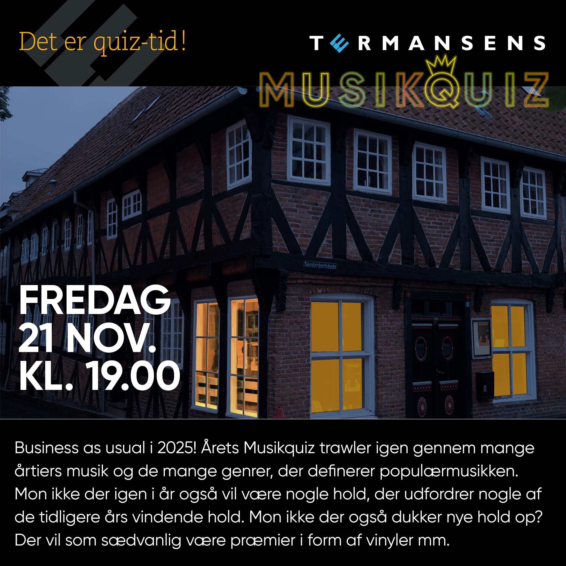 Kom og vær med til en uforglemmelig Musikquiz på Termansens i Ribe! Vinyl Venner Vender Vinyl har slået sig sammen med to erfarne quiz-masters og inviterer til en sjov og udfordrende quiz-aften. Der er allerede tilmeldt otte hold, heriblandt: Rocksperterne, Hit Diggers, Teachers, Antiques Roadshow, Hyggeholdet, Pick Me Up og Hold, li’æ hund.