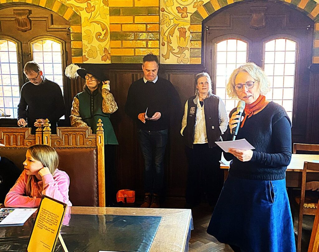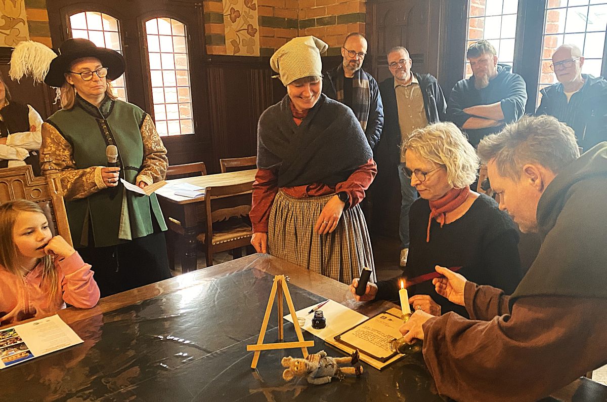 Det var kommunens kulturchef, Ulla Vibech, der signerede skrivelsen og forsynede den med segl assisteret af et par ansatte iklædt gamle dragter.