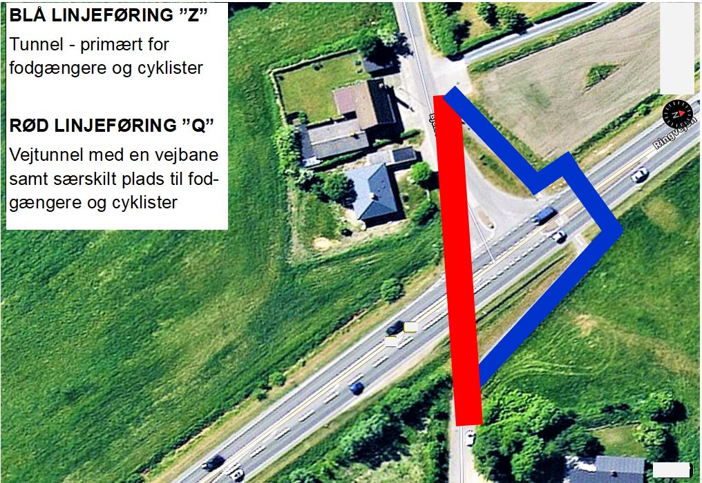 Hvis der skal være en løsning med cykel-/gangsti, inden for den nuværende linjeføring, så skal der ske en hævning af selve vejbanen – det sker også ved cykel-/gangstien ved Plantagekrydset. Grundvandet ligger højt i området – og det bedste vil selvfølgelig være en sænkning heraf, men så skal Danmarks Naturfredningsforening nok kontaktes i rigtig god tid.