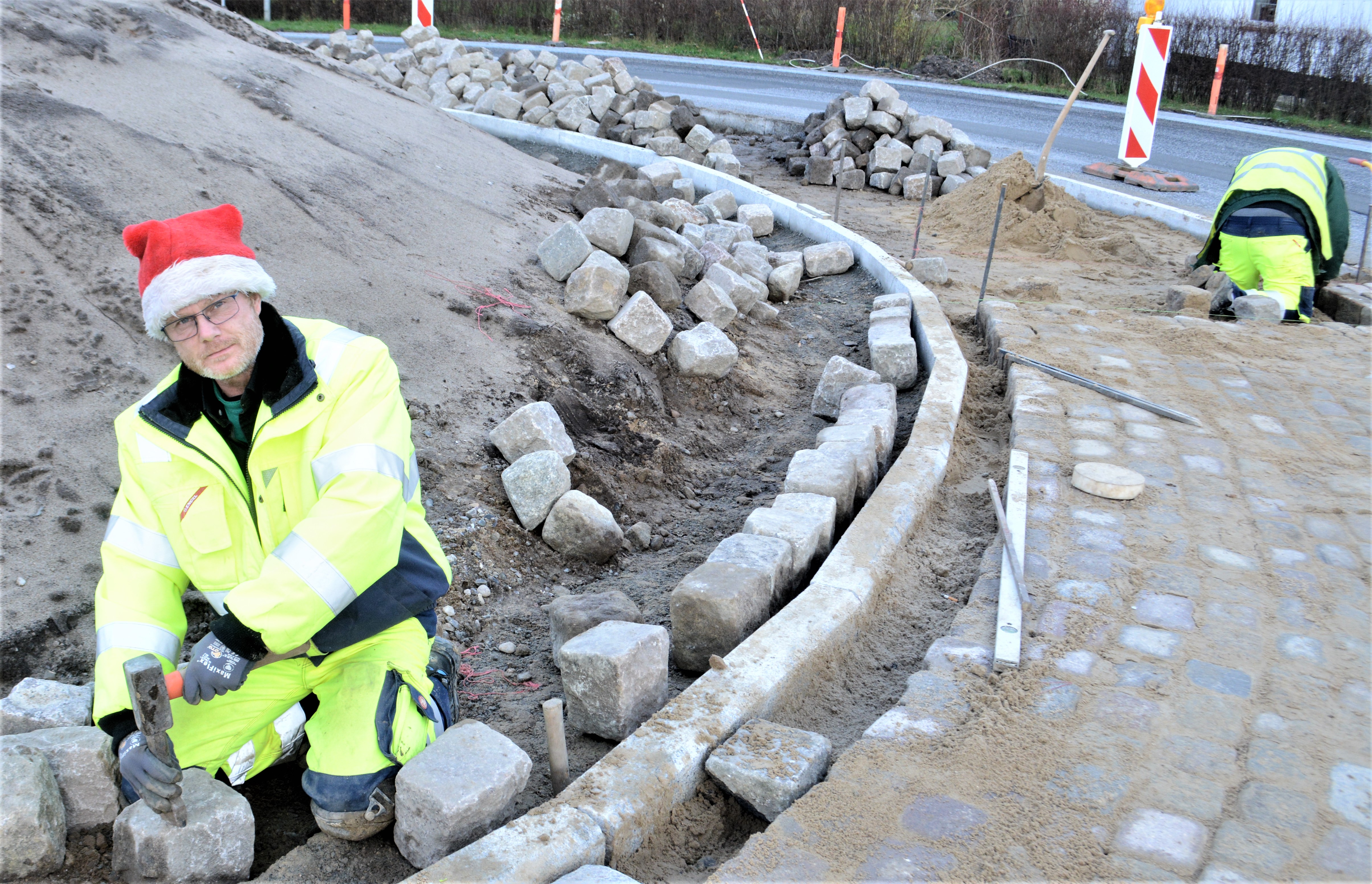 Carsten er brolægger og arbejder i øjeblikket sammen med kolleger i den nye rundkørsel ved Obbekærvej-Nørremarksvej. Og mens hans kolleger har gode, varme huer på hovedet, lægger Carsten brostenene med en nissehue på hovedet.