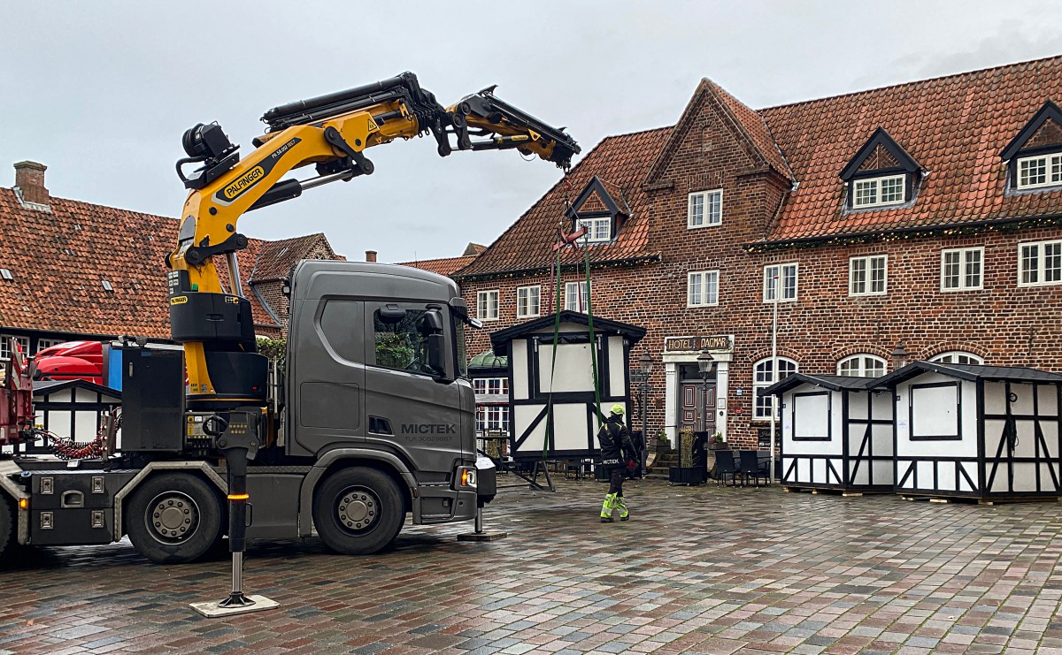 Julehytterne dukkede netop op denne tirsdag formiddag og sikkert anbragt på Torvet af vognmandsfirmaet MICTEK, så hytterne nu er klare til at blive taget i brug og gøre julen ekstra festlig i den gamle by.