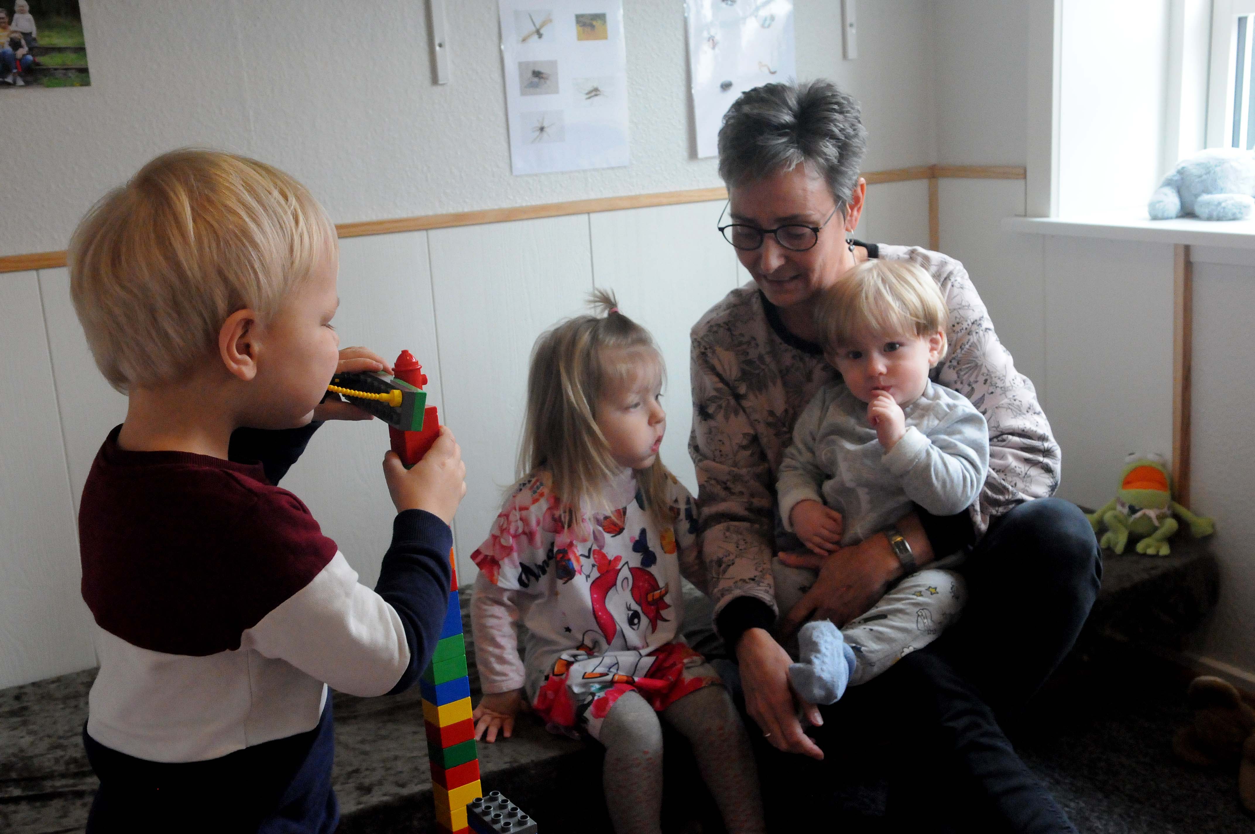 Sammenlagt har jeg nok arbejdet som kommunal dagplejer i fjorten år, men de mange krav fik mig til at blive privat, fortæller Hanne Sunzenauer, mens Malthe, Nellie og Pelle hygger sig i legeværelset efter at have været en tur i haven og lege. Til maj starter det fjerde barn, men tomme pladser bliver der ingen af, og Hanne fortæller, at først i 2022 er der ledige pladser igen.