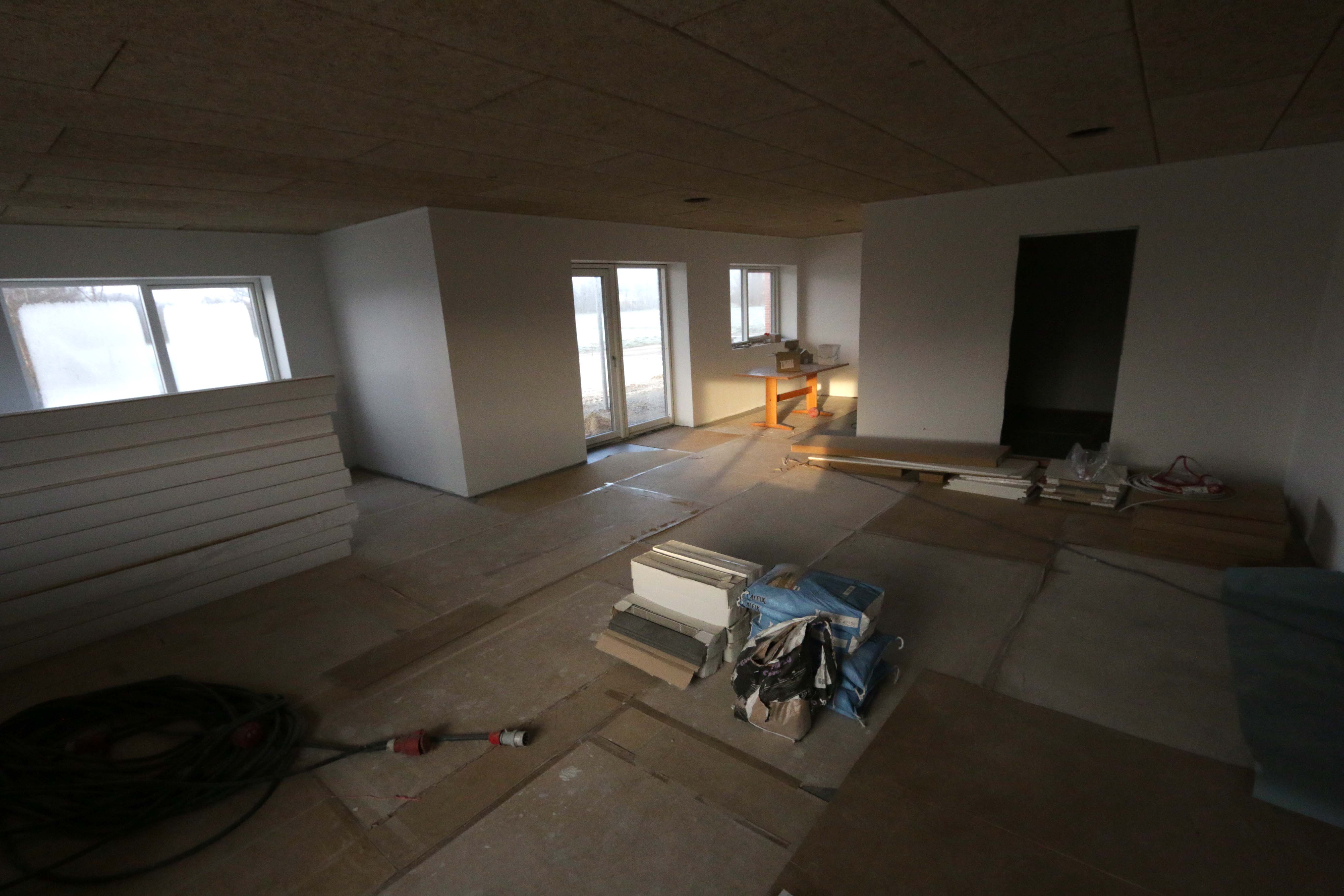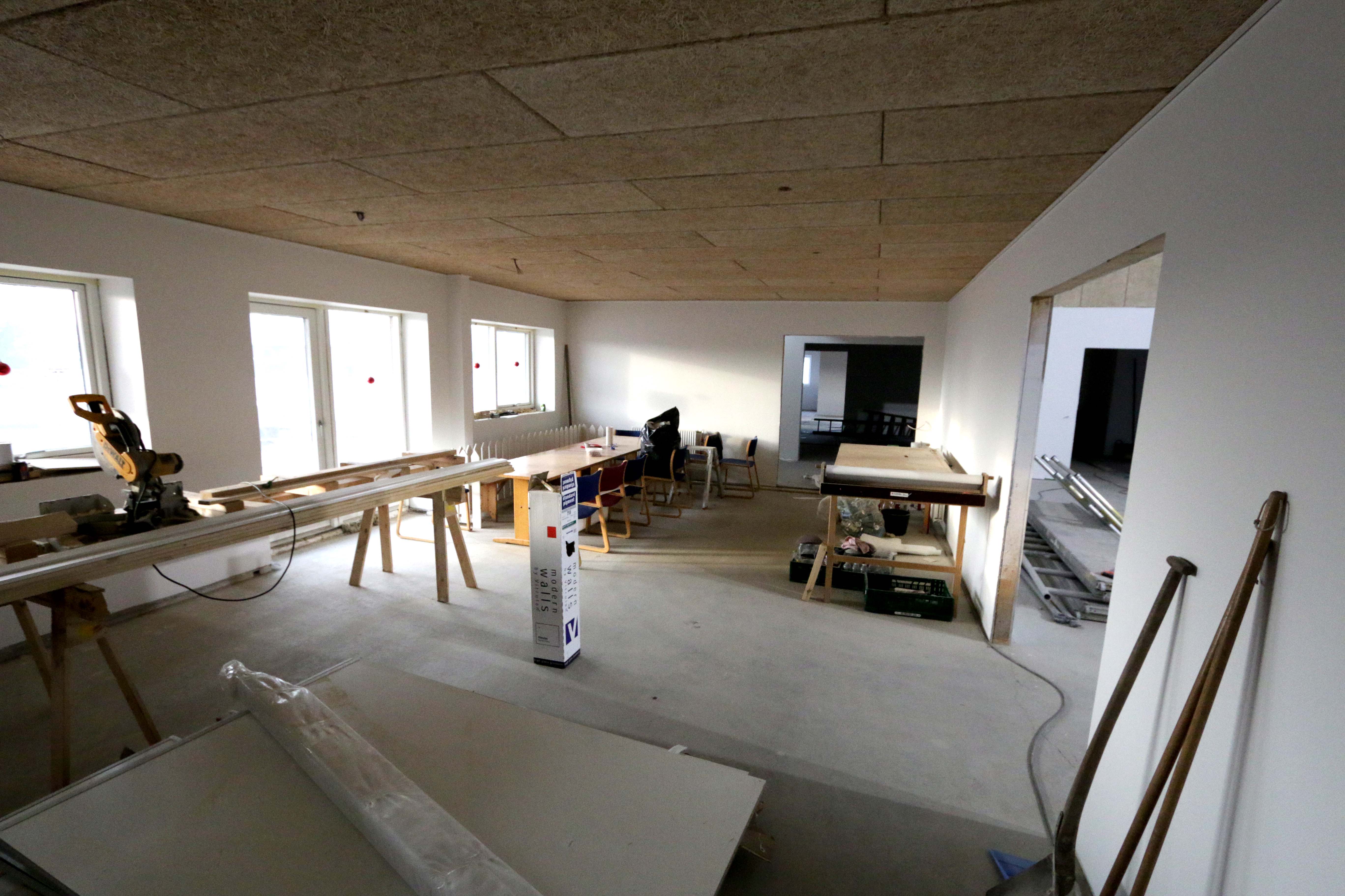 Ser man rundt i de mange rum, så begynder det at ligne noget – vægge og lofter er færdige og alle skyggelister er på plads. Der er kommer inventar til produktionskøkkenet og ikke mindst: der er blevet tilsluttet en kaffemaskine. Det er derfor helt naturligt, at ”pausebordet” har skiftet plads – og nu står tæt ved køkkenet.
