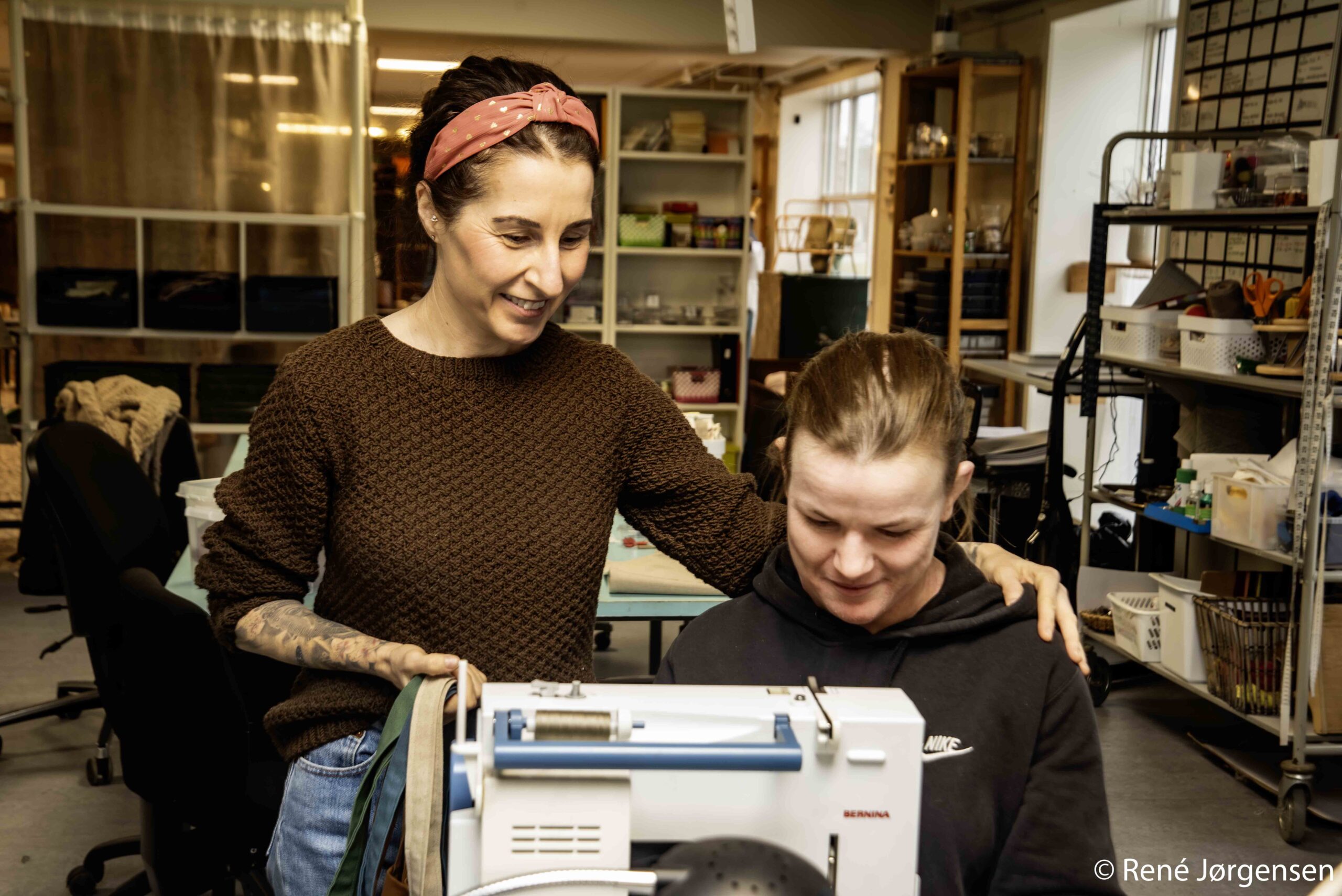 Til venstre Kiki der kigger på Camilla der er ved at sy den sidste stofpose før de skal til butikken på Nederdammen