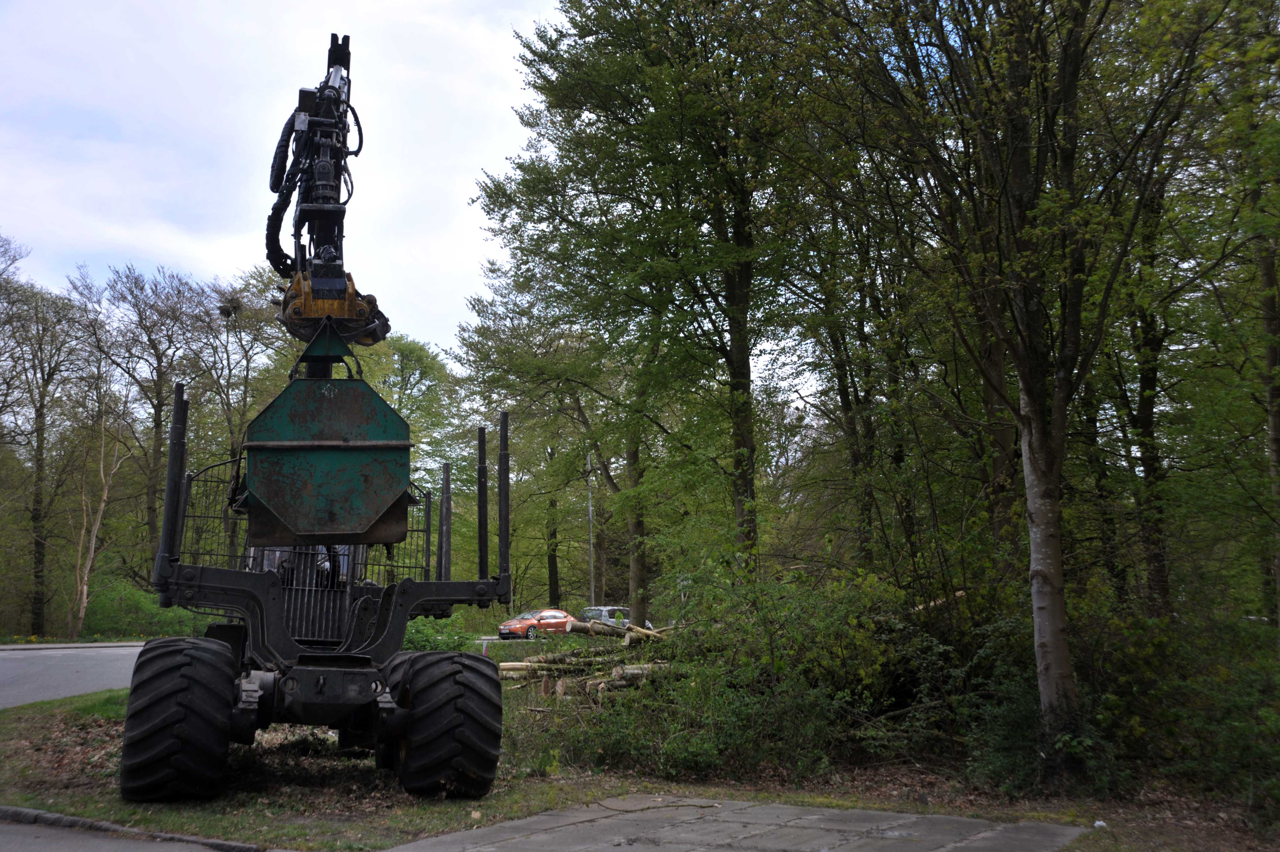 Klokken 14.30 gik skoventreprenøren fra firmaet Brdr. Højrup A/S Jelling i gang med fældningen af det ca. 2000 kvadratmeter store skovareal på Plantagevej i Ribe.