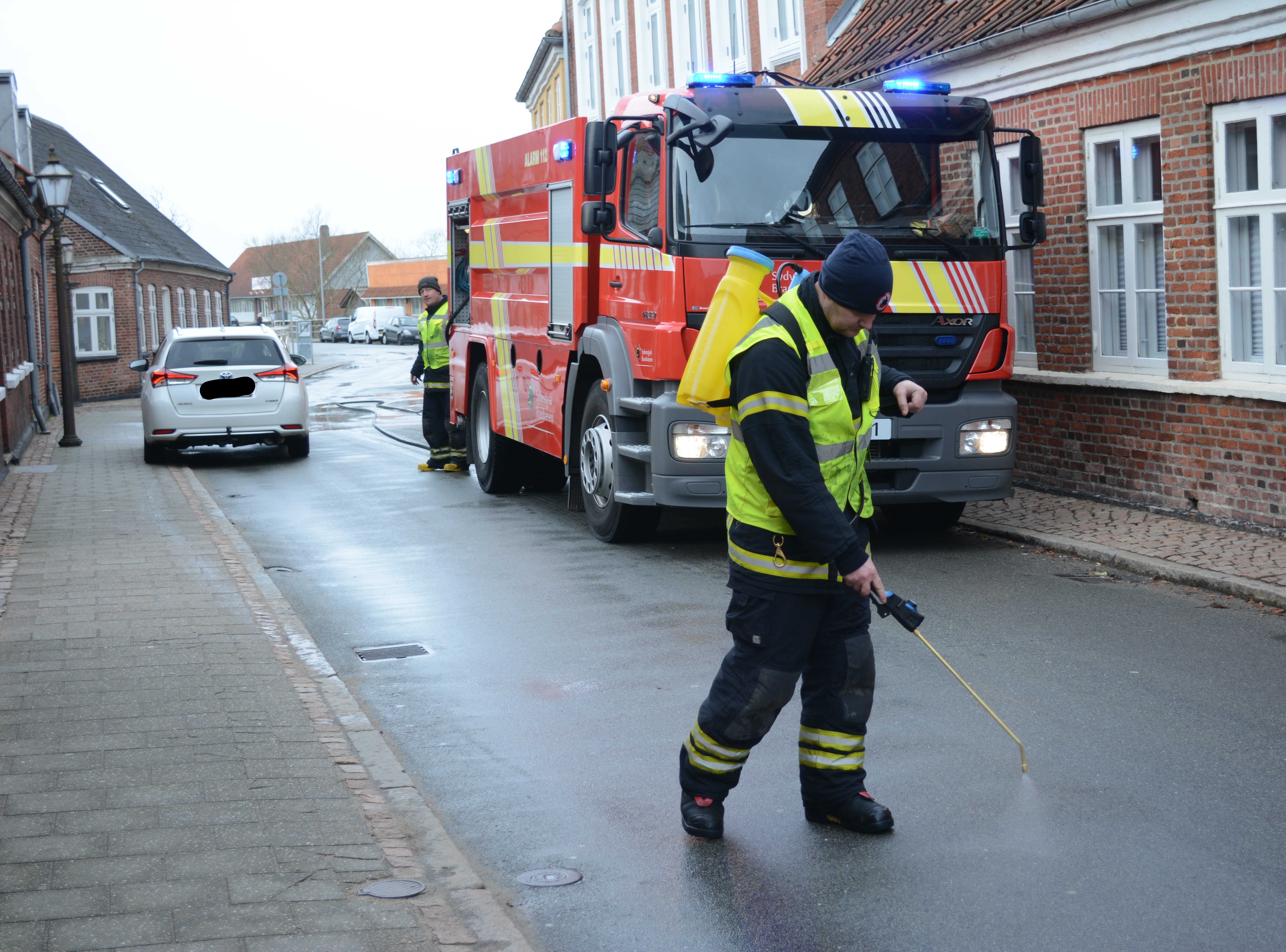 Heldigvis var der ikke megen trafik i Ribe denne lørdag formiddag, så mandskab fra Sydvestjysk Brandvæsen havde nogenlunde arbejdsro, da brandfolkene skulle rense adskillige vejstrækninger for spildt dieselolie.