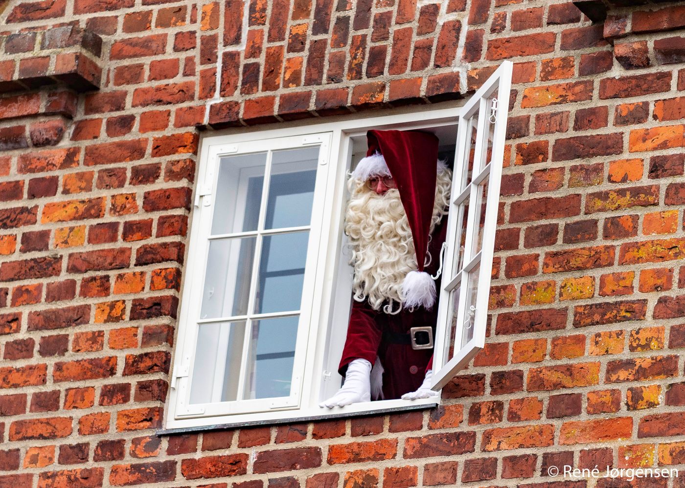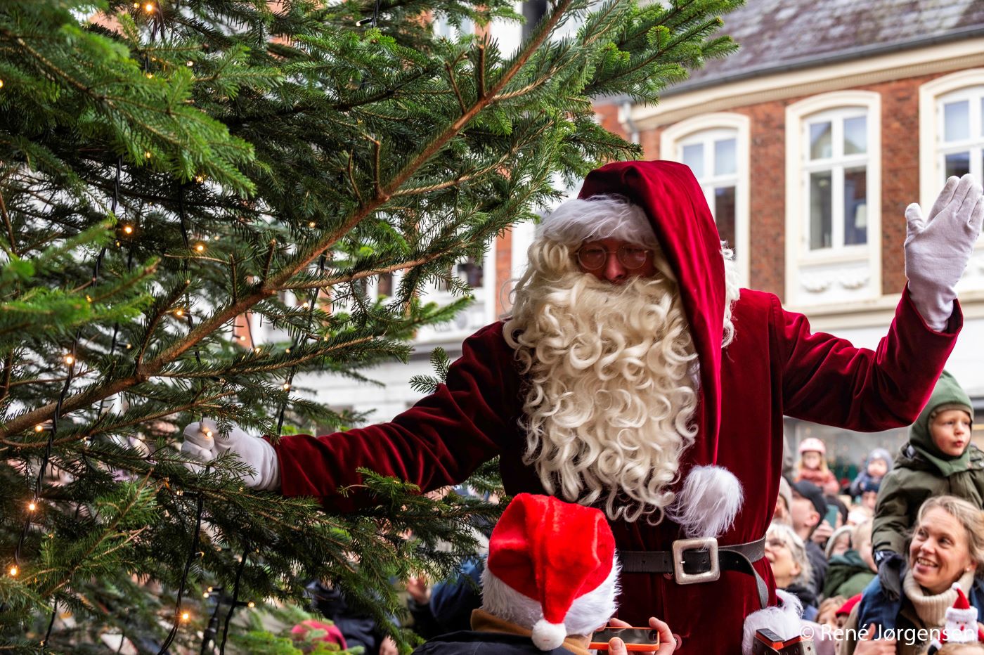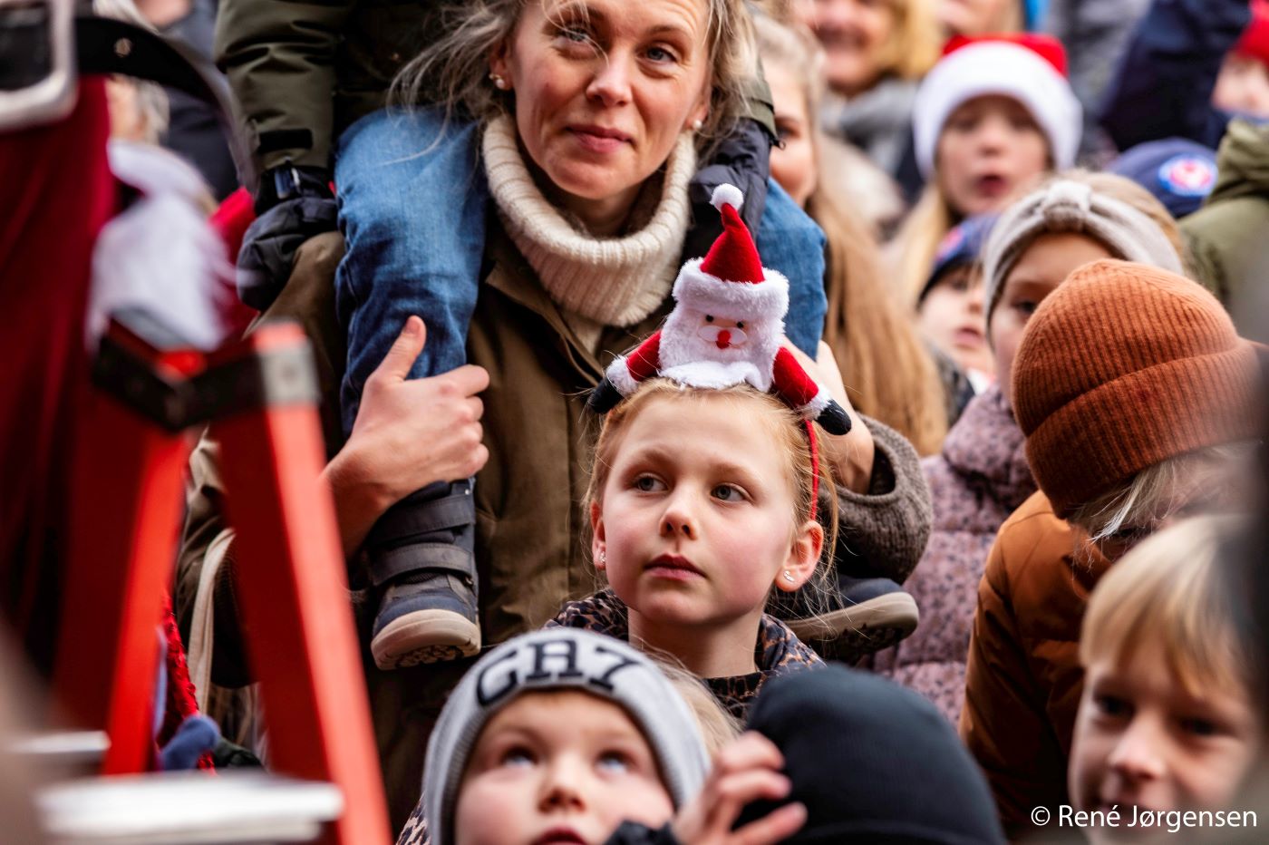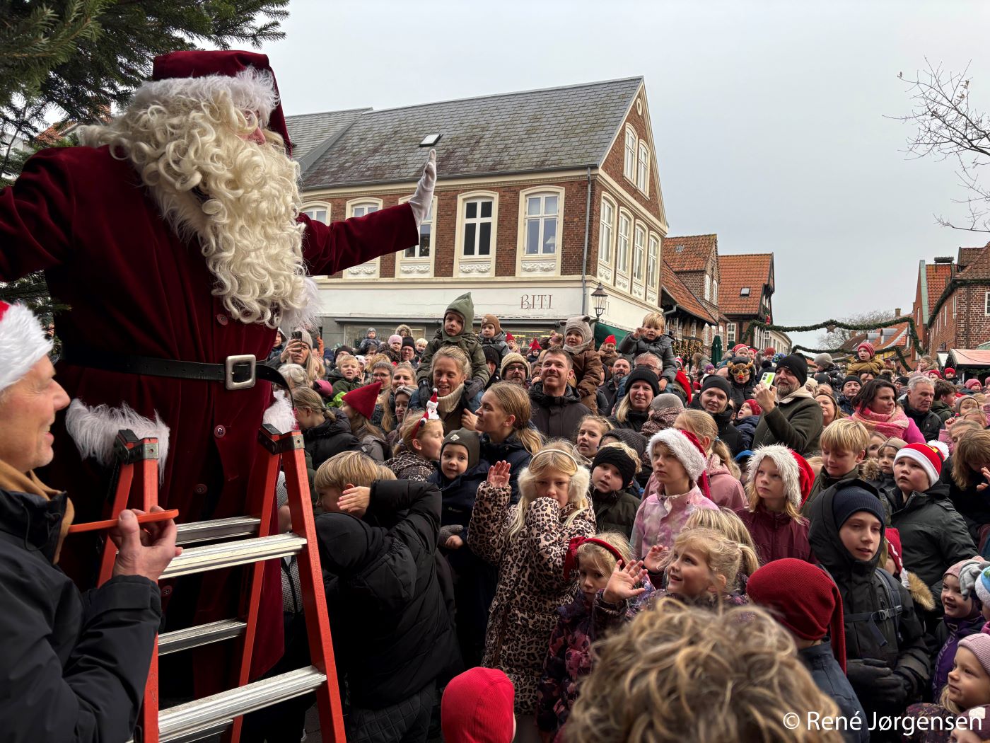 Præcis kl. 10.00 fik vi svaret. Efter at de mange børn på det stopfyldte torv havde råbt så højt JULEMAND – JULEMAND – JULEMAND, at han endelig vågnede, stak han hovedet ud af lugen i taget og ønskede alle – men især børnene – en rigtig glædelig jul. Herefter bevægede han sig langsomt gennem folkemængden hen til det store, flotte juletræ, og med en fælles nedtælling fra ti til tænd, kom der lys i det kæmpestore træ på torvet.
