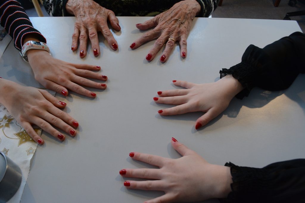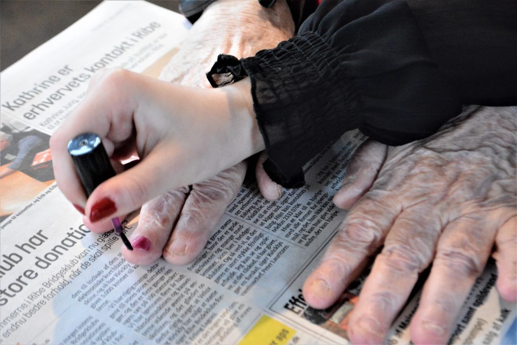 Sådan på plejehjemmet Dagmargården den 23. december om eftermiddag, hvor de to veninder Klara og Kathrine sørgede for at lægge neglelak på neglene hos de damer, der ønskede det. Og det var der mange, der gjorde.