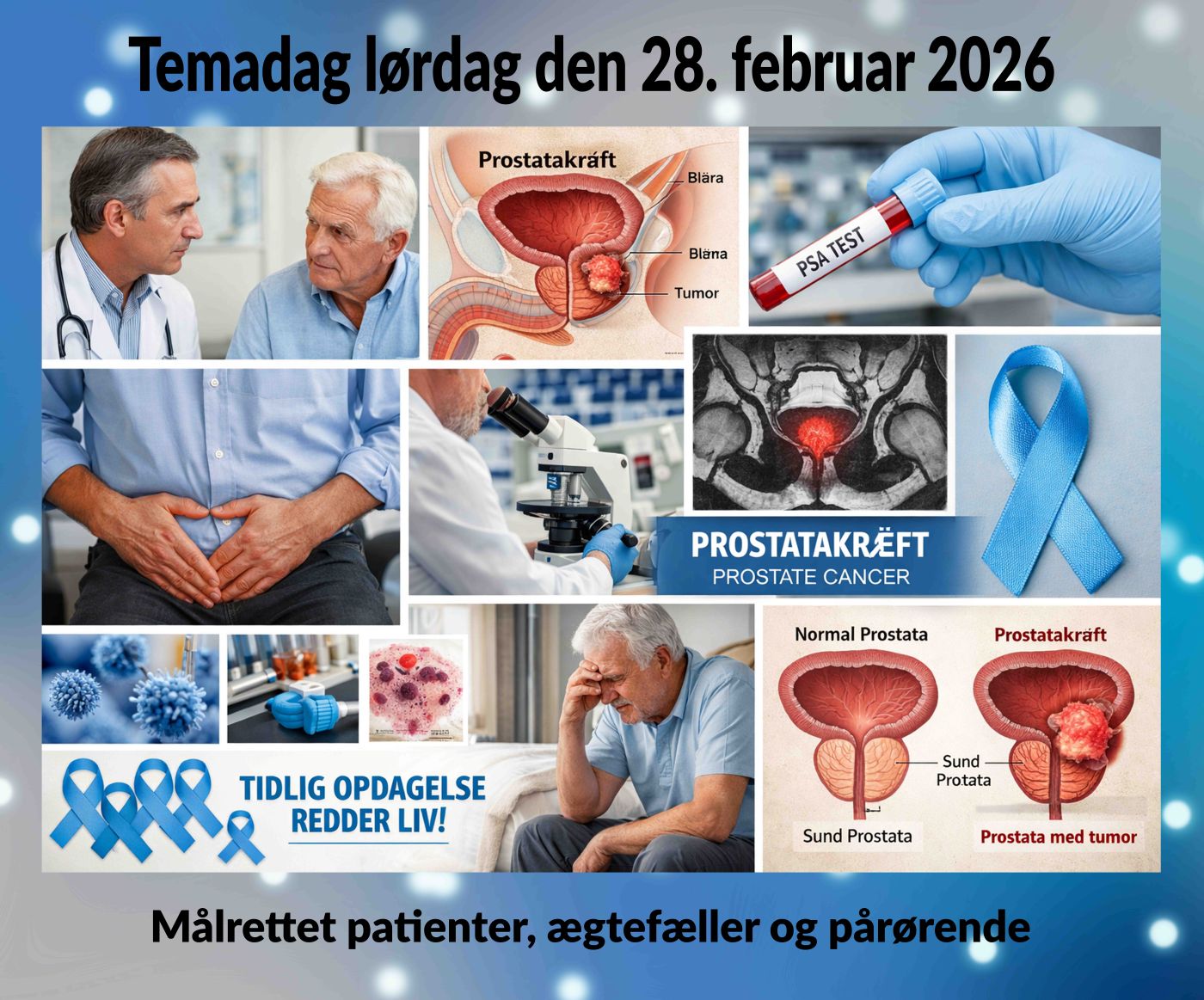 Lørdag den 28. februar 2026 afholdes der temadag om prostatakræft i Kongeåhallen i Gredstedbro. Det er et heldagsarrangement med fokus på oplysning og viden, målrettet både patienter og ægtefæller eller andre pårørende.
