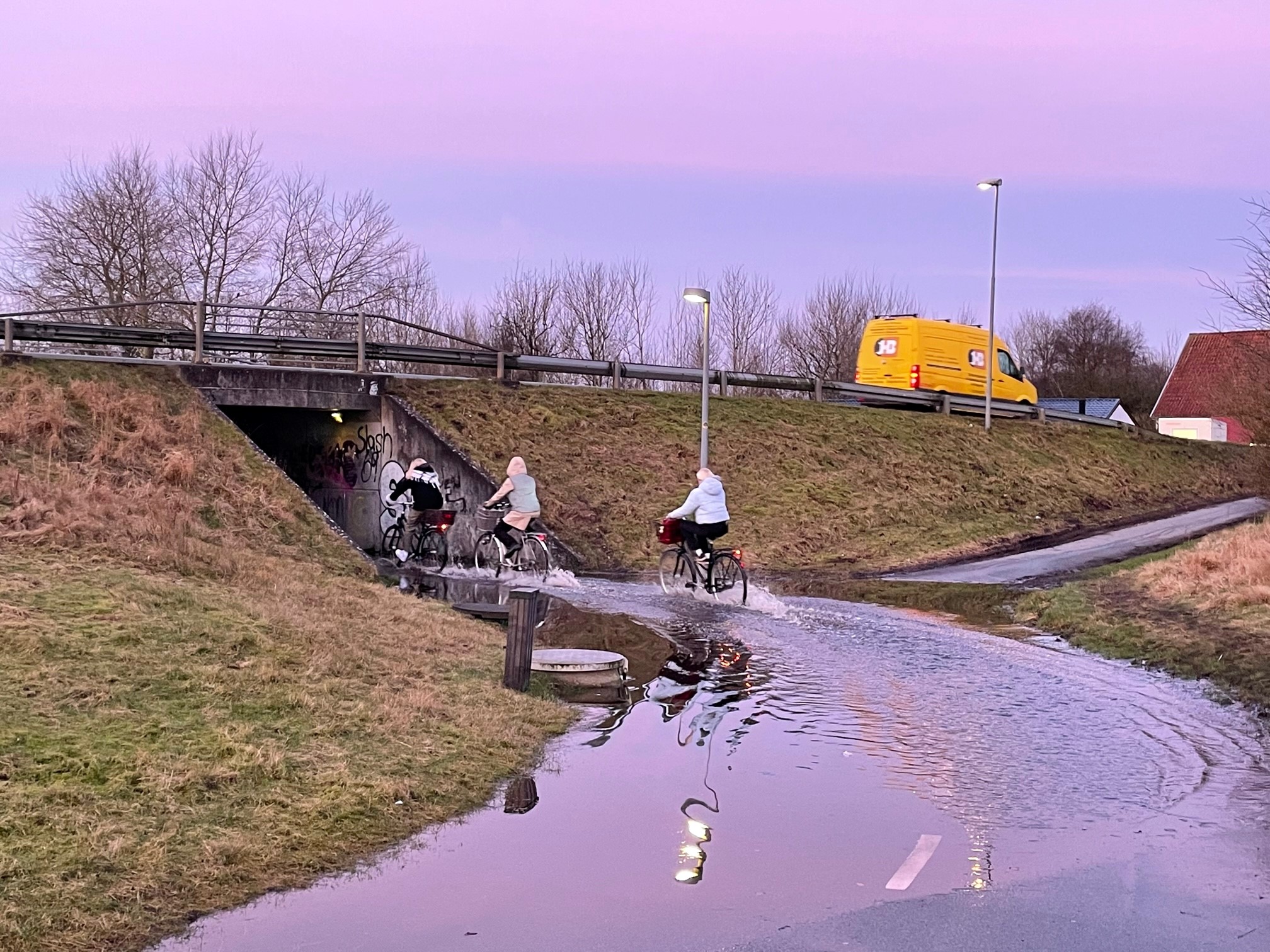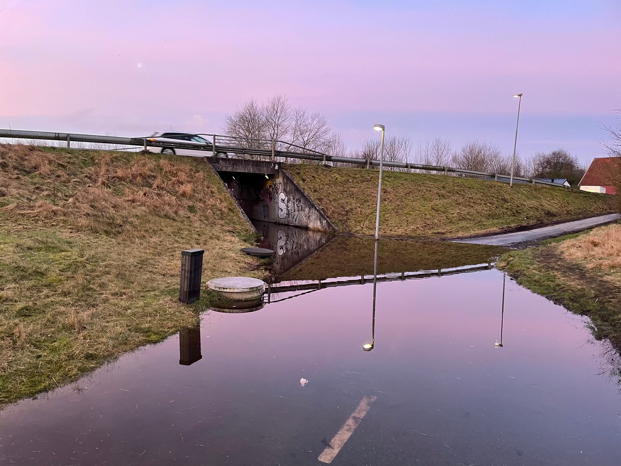 De store nedbørsmængder og afvandingen af store områder øst for byen, som skal ske gennem Tved Å giver udfordringer for cyklister, der skal benytte tunnelen under Obbekærvej. Da Anders var forbi hertil morgen, stod der masser af vand, men i følge leder af Distrikt Ribe Hans Korsgaard Laursen er der nu blevet sat skilte op. – Det er Forsyningen, der har ansvaret og de oplyser, at pumperne kører for fuld kraft. Vanddybden er pt. 10-15 centimeter og kan passeres på cykel.