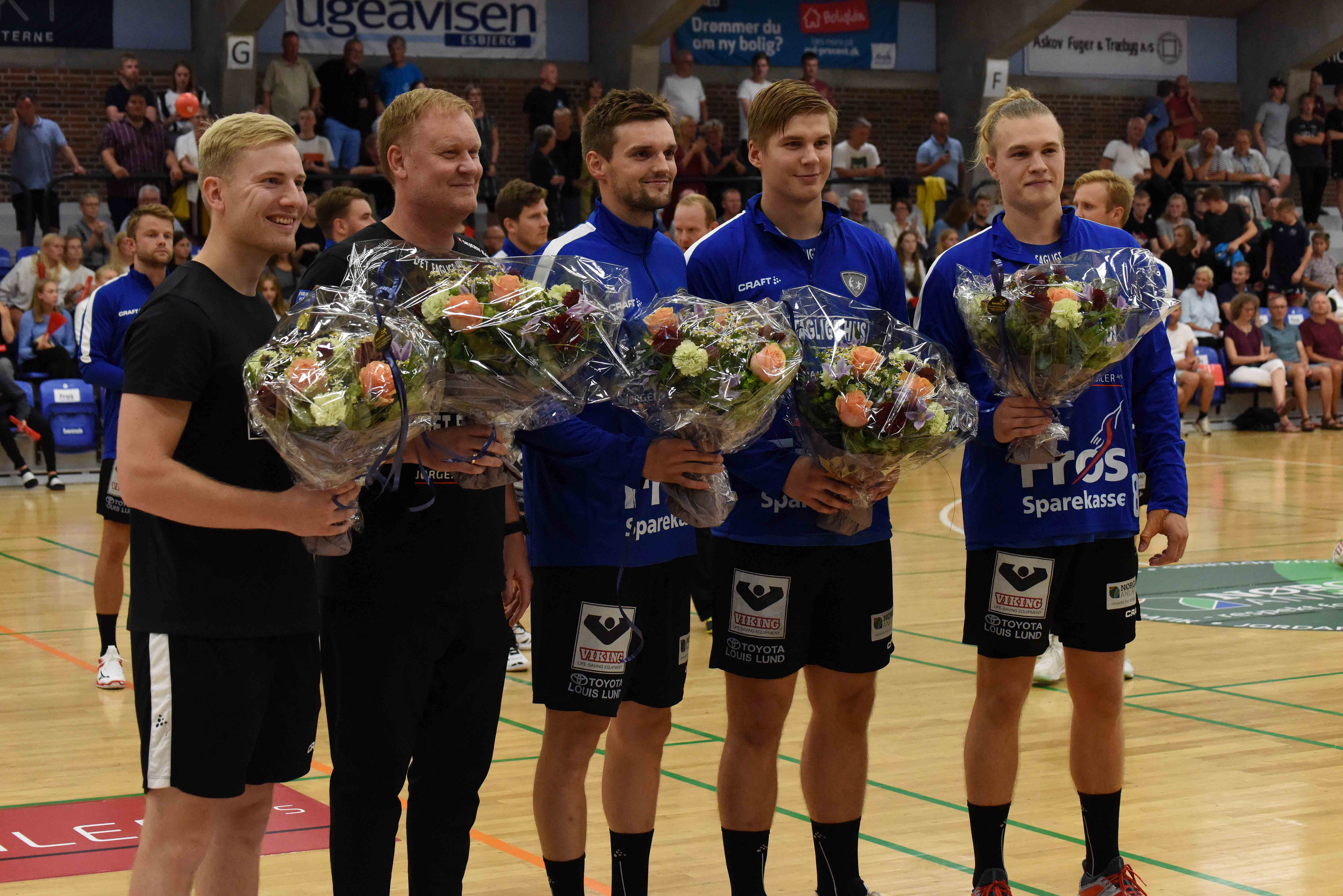 De nye spillere Uth, Ingason og Mosing samt fysioterapeut Mikkel Mathisen og assistenttræner Kristian Kristiansen fik blomster før 1/8-finalen – nu gælder det point
