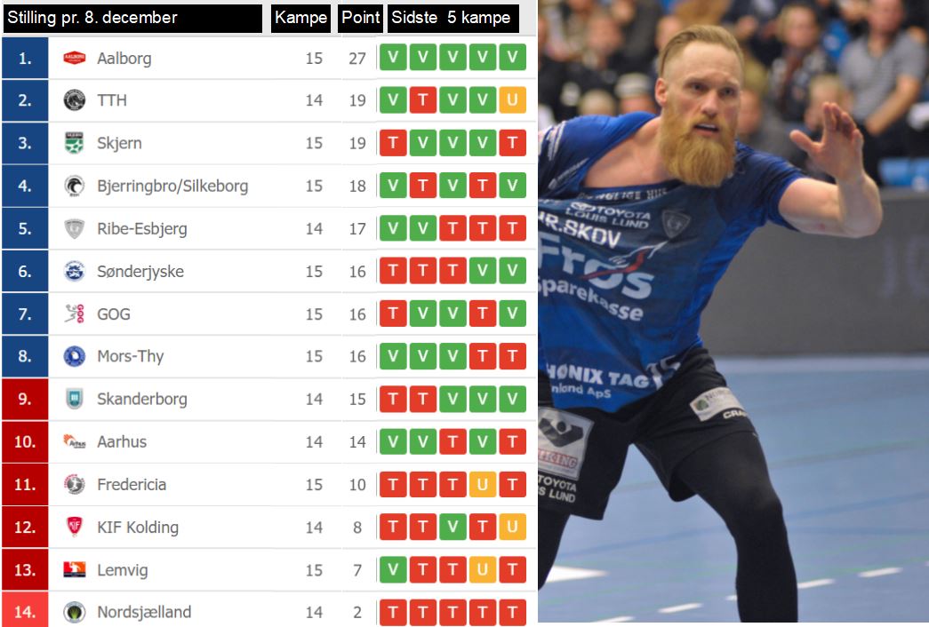 Aalborg Håndbold er stukket af – og inden mandagens kampe 8 point foran nummer to. Der er dækket op til ”topkamp”, når Ribe-Esbjerg HH møder TTH Holstebro i Gråkjær Arena – nummer to mod nummer fem. Holdene står normalt godt til hinanden – og har hver en sejr i dette efterår. TTH vandt pokalkampen mod REHH, men tabte så senere turneringskampen.