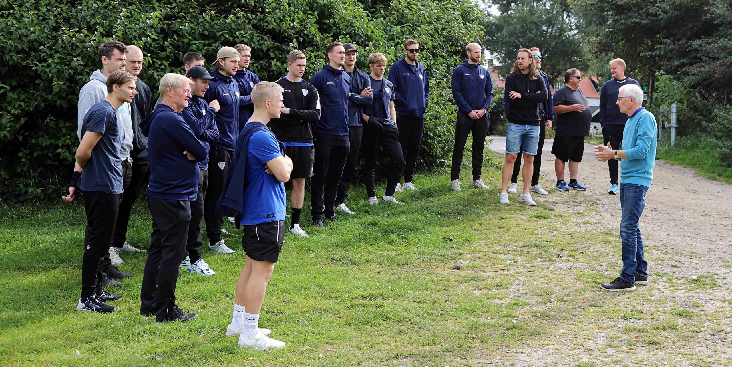 En veloplagt Lars Lundgård orienterede spillere og trænerstab om dagens program på Hovedengen, inden man i samlet flok besøgte de kendte turistmagneter som Stormflodssøjlen, Præstegade, Slipperne, klostret og Domkikren. og til sidst fik en frokostsandwich i den gamle amtsmandshave i Puggaardsgade. Lars gjorde meget ud af, at man i Ribe-Esbjerg HH skal fejde for innovationskulturen – og holdet fik fortællingen om, hvordan Ribe-Esbjerg HH opstod – og ikke mindst hvordan fordelingen rent sponsormæssigt er tippet over på Esbjergs side. Han slog dog fast, at uden Ribe HK og SGI Håndbold, var projektet ikke nået dertil, hvor det er i dag.