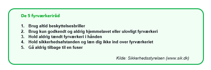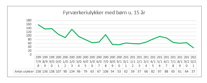 Fra den 27. december til og med den 1. januar er det lovligt at antænde fyrværkeri i Danmark. Fyrværkeri kan se flot og farverigt ud på nattehimlen, men det farlige krudt er også årsag til, at mange danskere kommer ud for en ulykke. For nytårsdøgnene 2020/2021 blev der registreret 37 fyrværkeriulykker i hele landet blandt børn under 15 år. Dette ses af de årlige opgørelser fra Ulykkes Analyse Gruppen ved Odense Universitetshospital, der siden 1995 har registreret fyrværkeriulykker for hele landet i nytårsdøgnene.