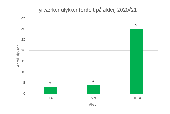 37 fyrværkeriulykker med børn under 15 år på landsplan ved seneste nytårsdøgn (2020/2021). Blandt børnene er det særligt de 10-14-årige, som er udsatte. De stod for 81 % af børnenes skader sidste nytår.