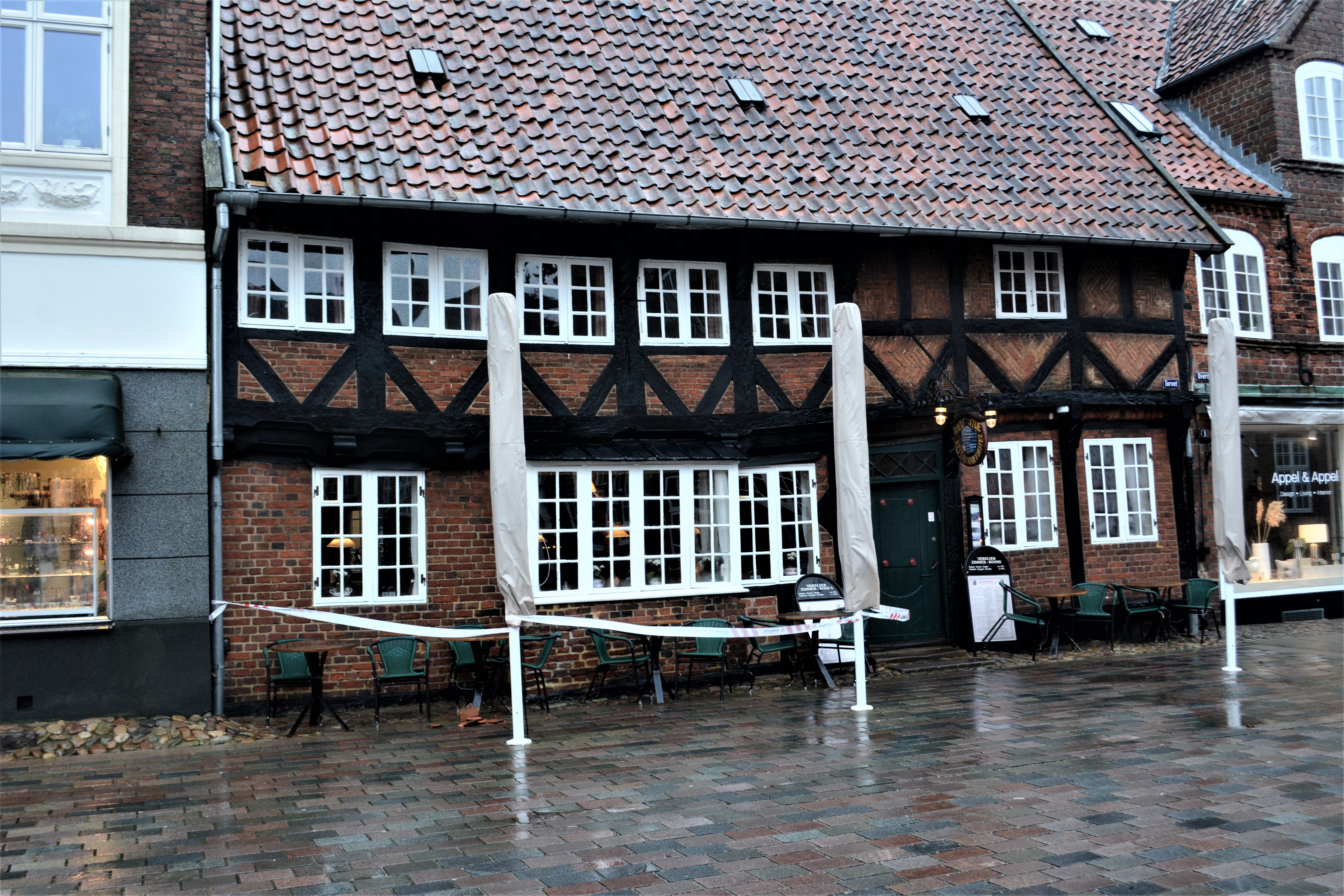 Indsatslederen ved brandvæsnet måtte en tur på Torvet, hvor en tagsten var blæst ned fra taget på Weiss Stue, men en afspærring af det område, hvor stenen var faldet ned og flere måske kunne følge efter, klarede problemet. Bu er det op til håndværkerne at klare sagen, når vejret arter sig.