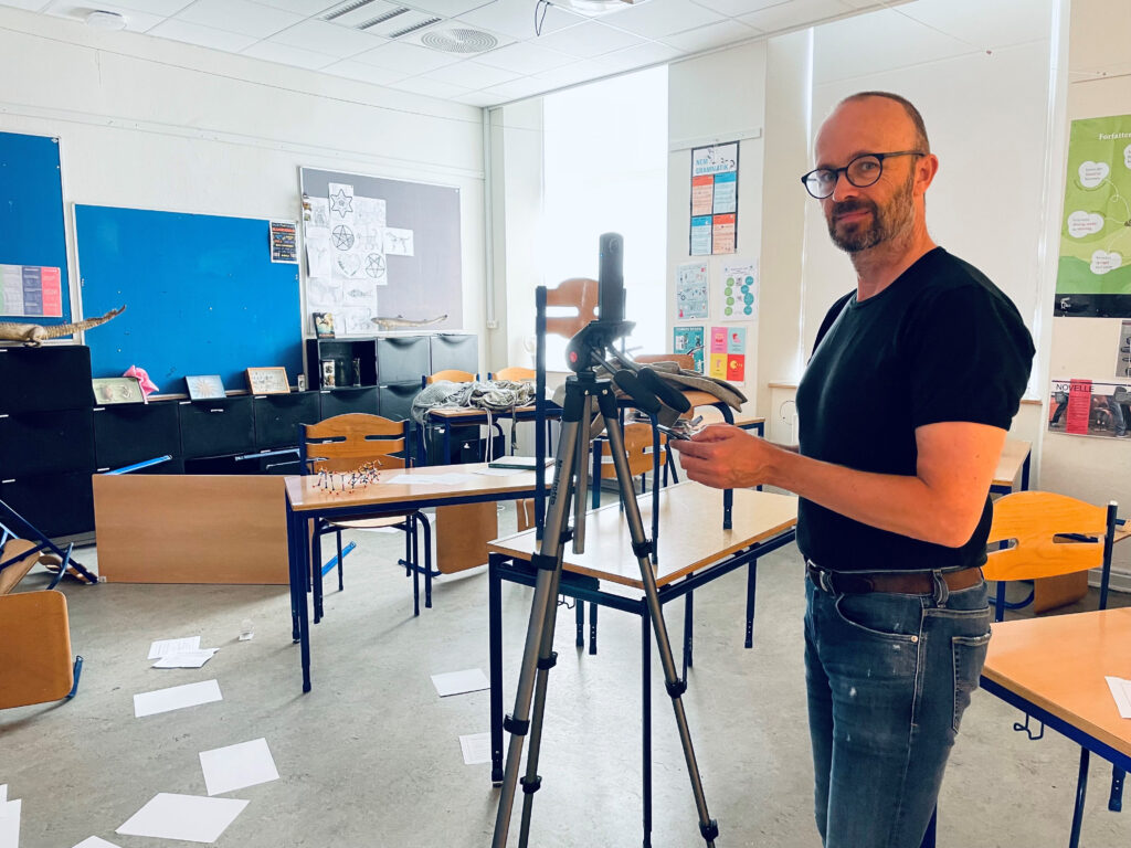 Det er et hold på fire fra Esbjerg Kommunes Biblioteker, der har lånt et klasselokale på Rørkjær Skole Urban i Esbjerg, bragt det ellers så velordnede lokale i en passende kaotisk tilstand og foretaget videooptagelser i 360 graders virtual reality-format.