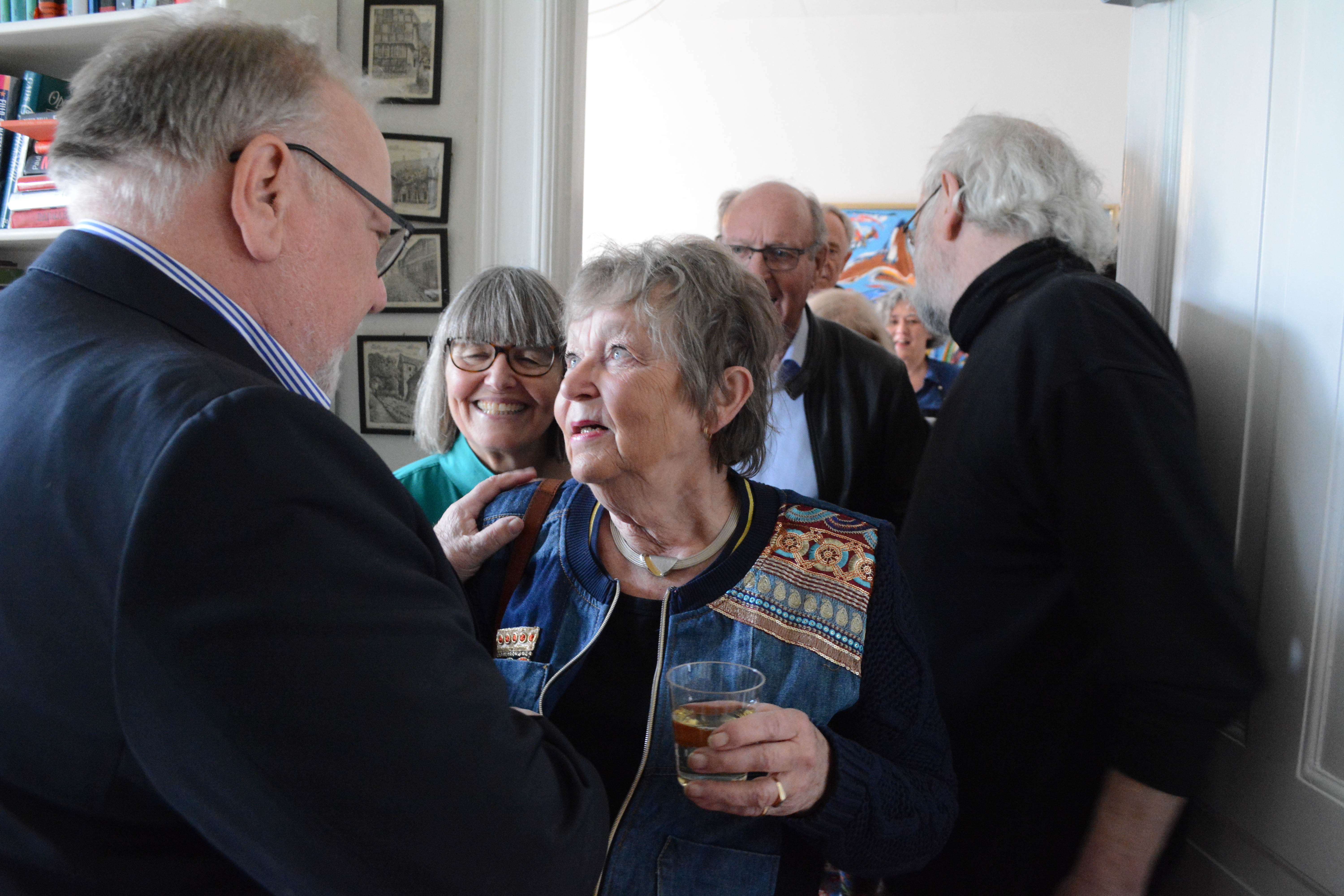 På billedet til venstre Ribes Marianne Tonnesen og Ekstra Bladets Claus Jessen. Til højre to af dagspressens gamle kæmper i Ribe, fødselaren og Frede Madsen, der nu residerer i Esbjerg.