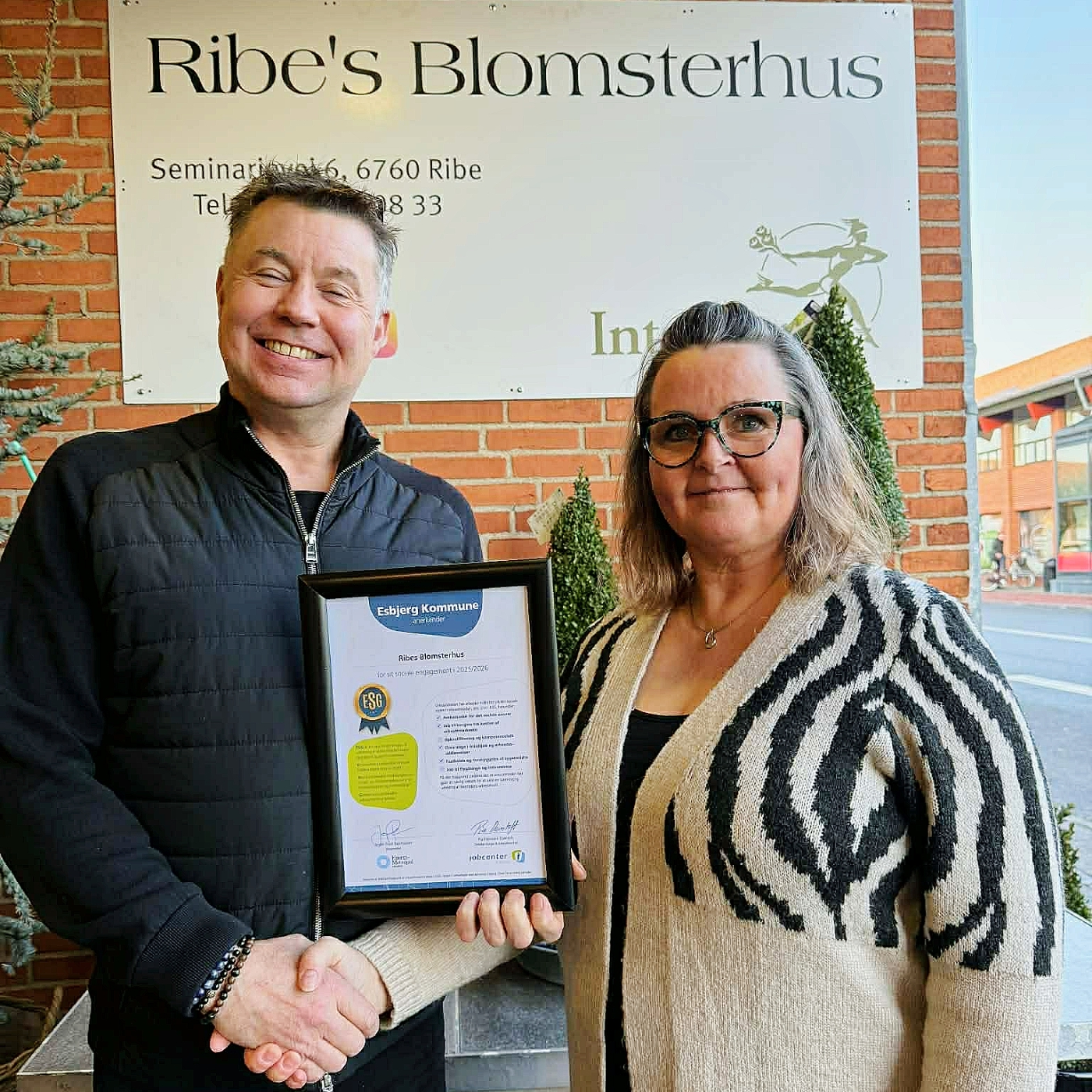 Ribes Blomsterhus modtog i går ESG-diplomet fra Esbjerg Kommune. Diplomet blev overrakt af jobkonsulent Anne-Mette Lindhardt fra Jobcenter Esbjerg som anerkendelse for forretningens målrettede indsats for at inkludere unge, der befinder sig i en fase præget af usikkerhed og endnu ikke har fundet en klar retning i livet.