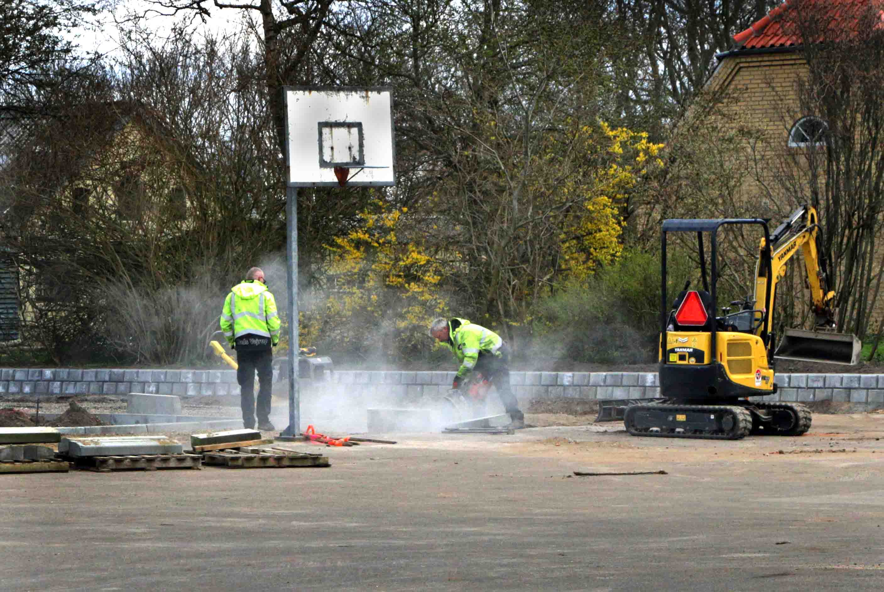 Mens RYK IND RIBE var på stedet var et hold håndværkere i gang med at skære de sidste kantsten.