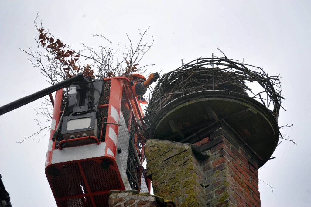 I midtbyen er der fem, og storkerederne blev søndag sat i stand, så de er klare til nye beboere. Det var storkeekspert Hans Skov, der forestod arbejdet ved hjælp af Farup Smedenes store kranbil, der med en mandskabslift med sikker hånd styret af Michael Vogt blev bragt til vejrs til rederne.