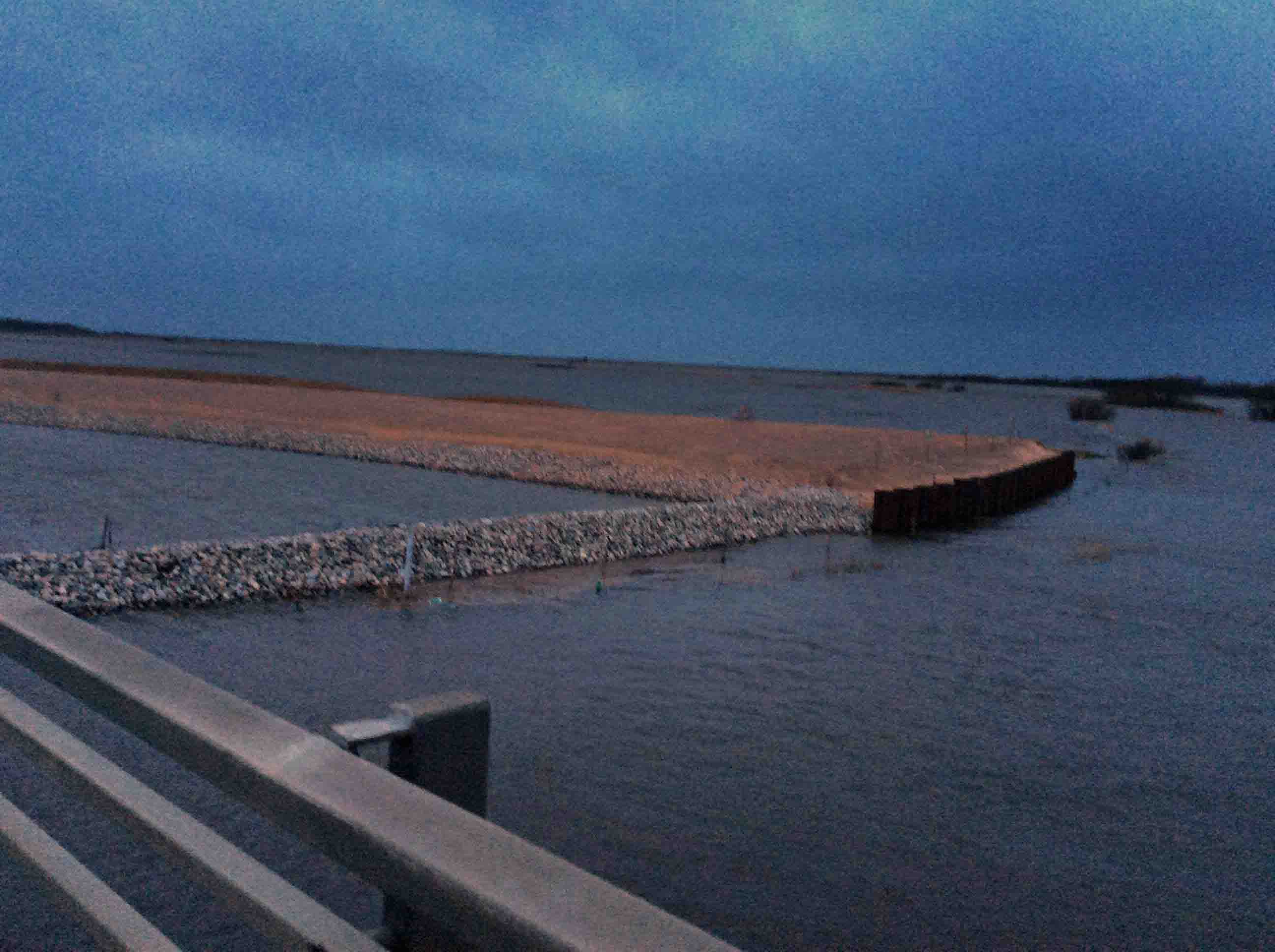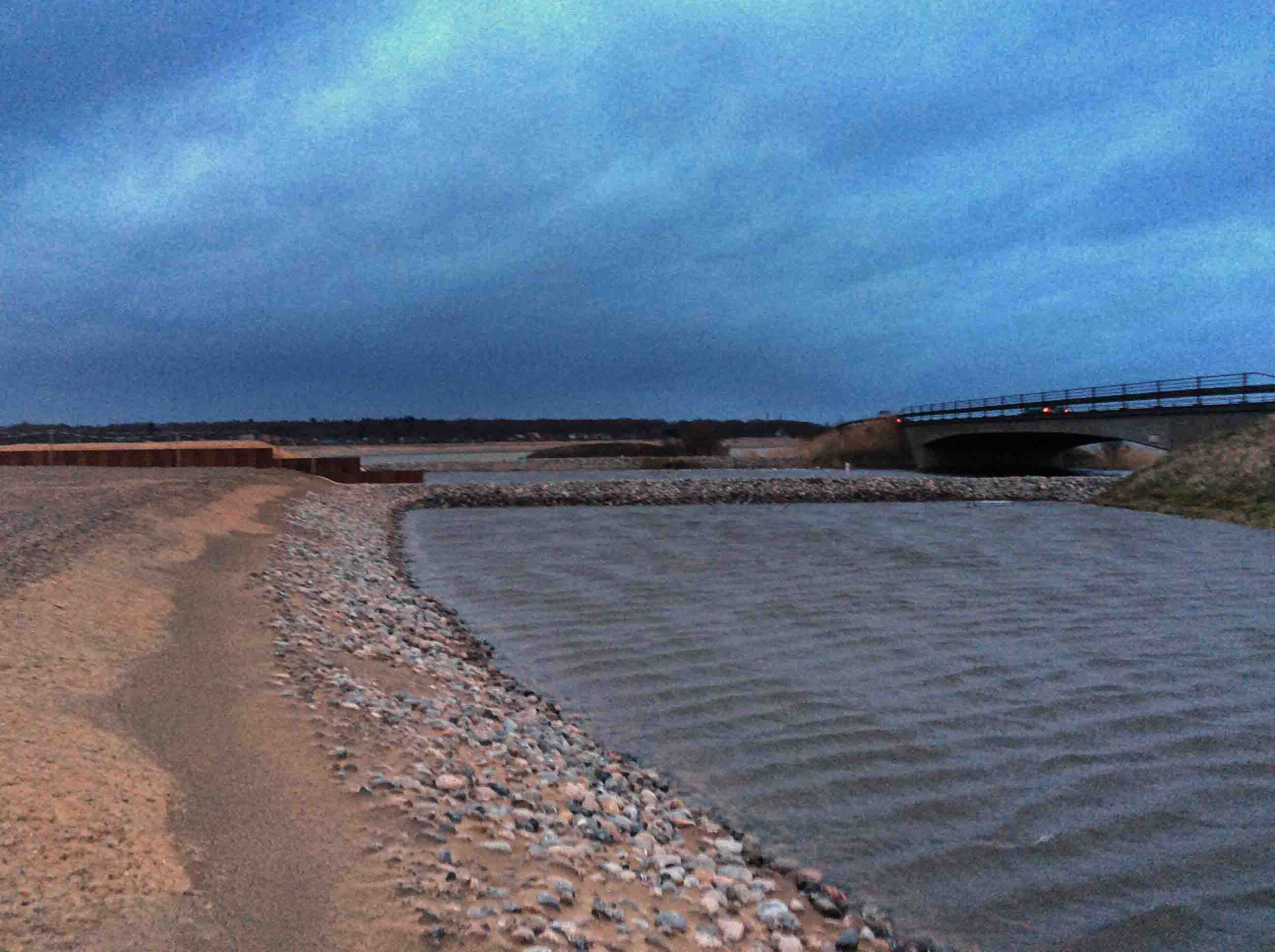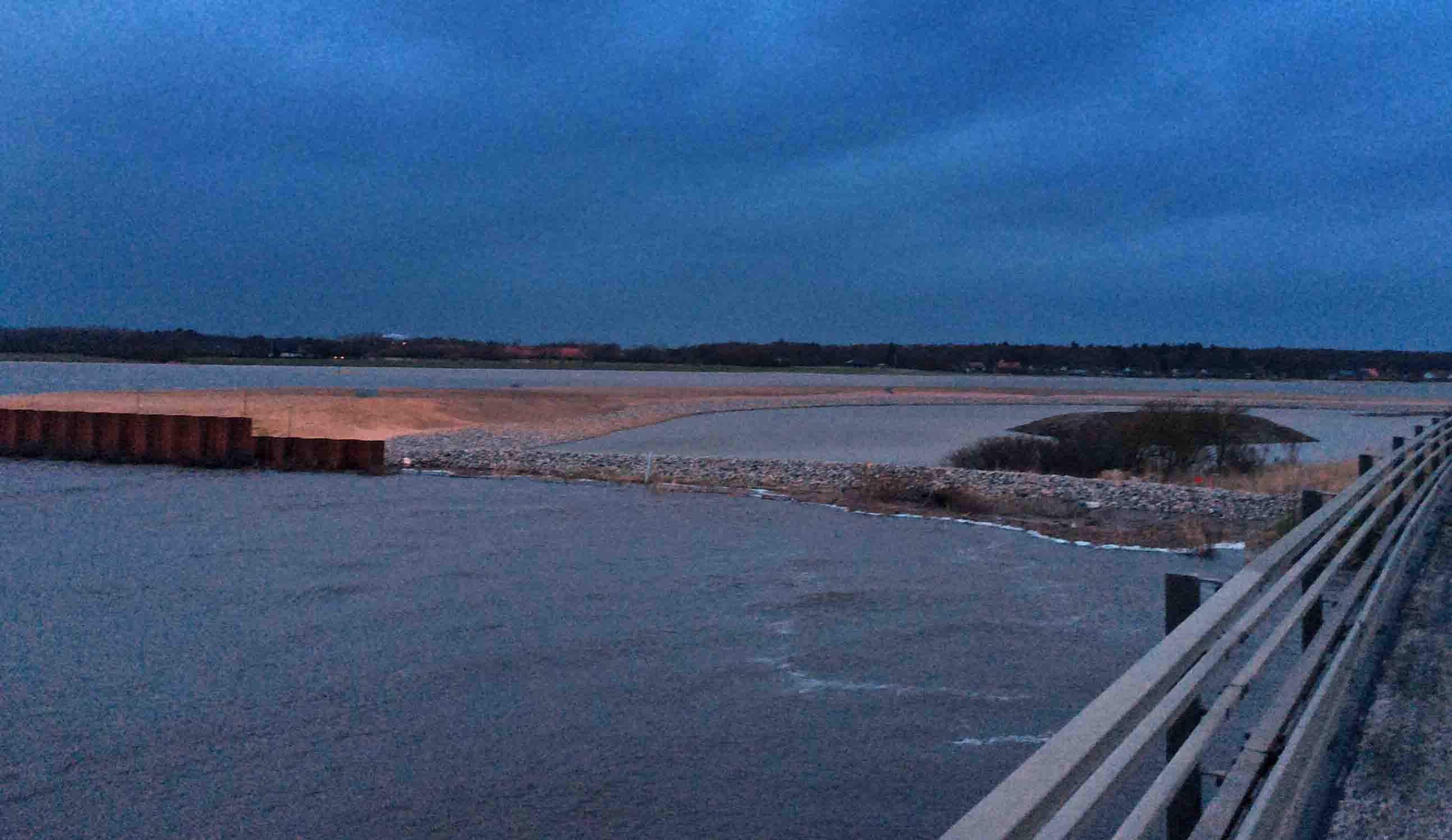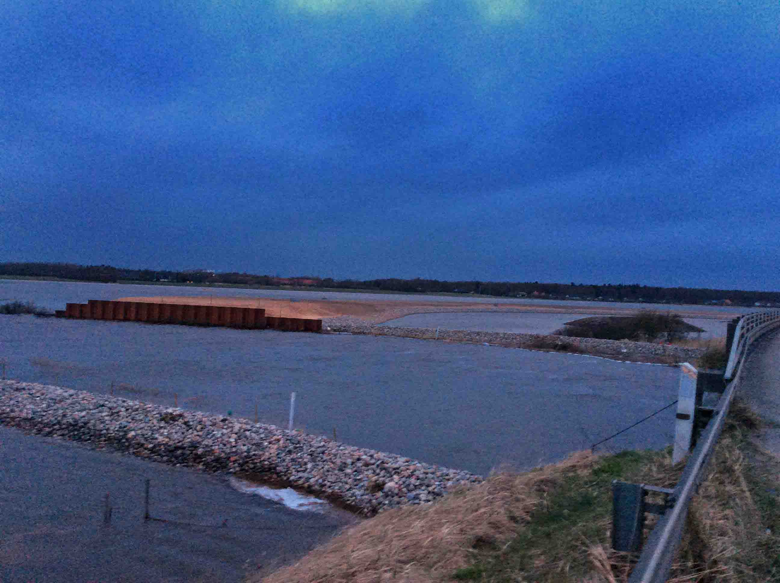 Nedbørsrekorden for marts måned er slået – og regnen fortsætter over hele landet. Omkring Ribe betyder de store vandmasser, at Ribe Vesterå er gået over sine bredder og presser på den midlertidige vej. Det er første gang siden anlægsfasen blev afsluttet i december, at der er så megen vand omkring sandvejen, men mon ikke de stor sten ligger uændret, når vandet i løbet af de næste dage forsvinder ud i Vadehavet.