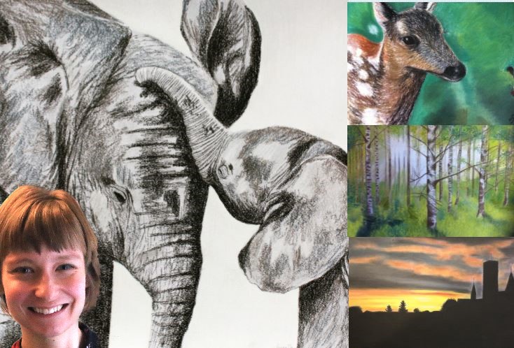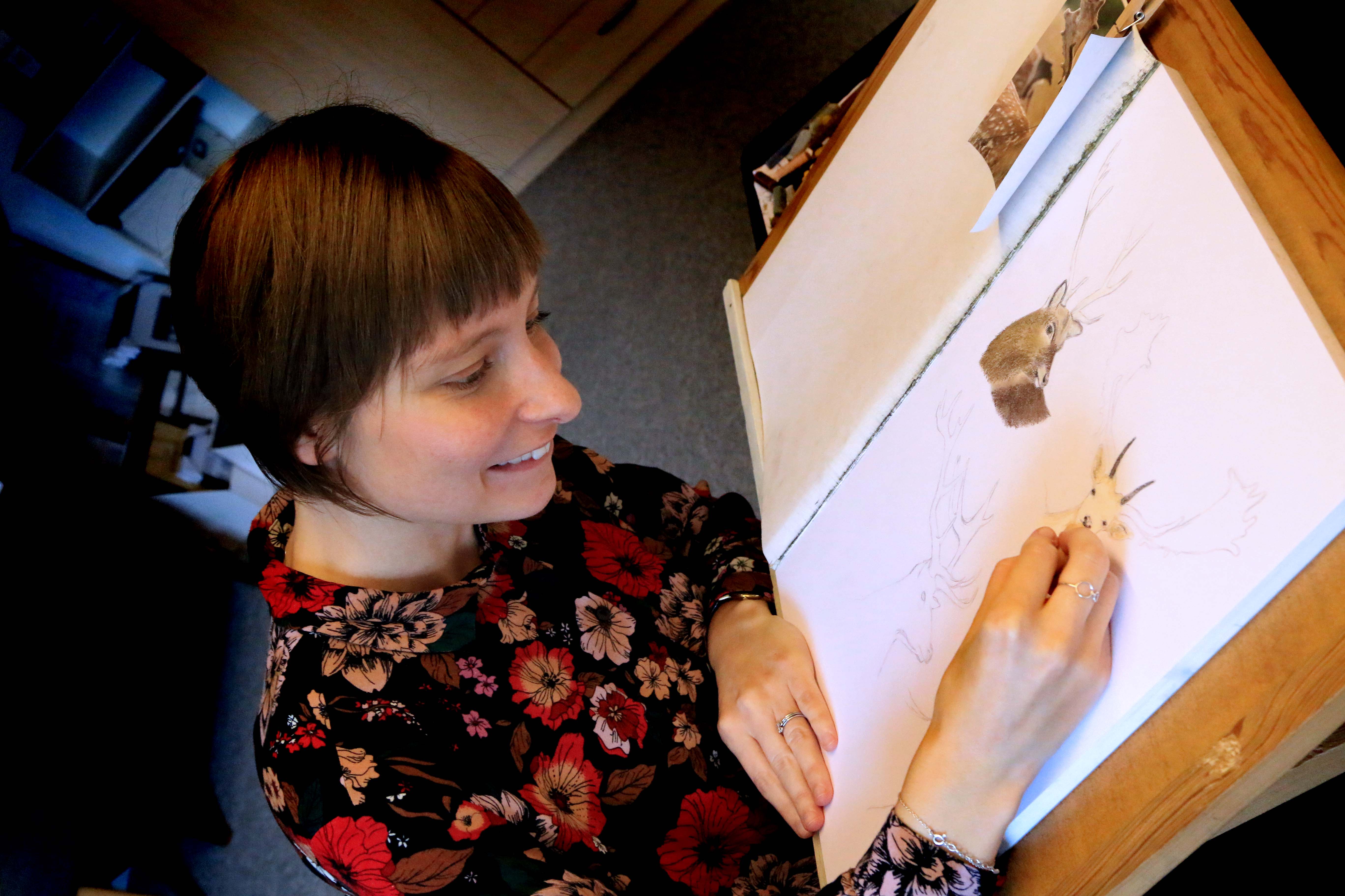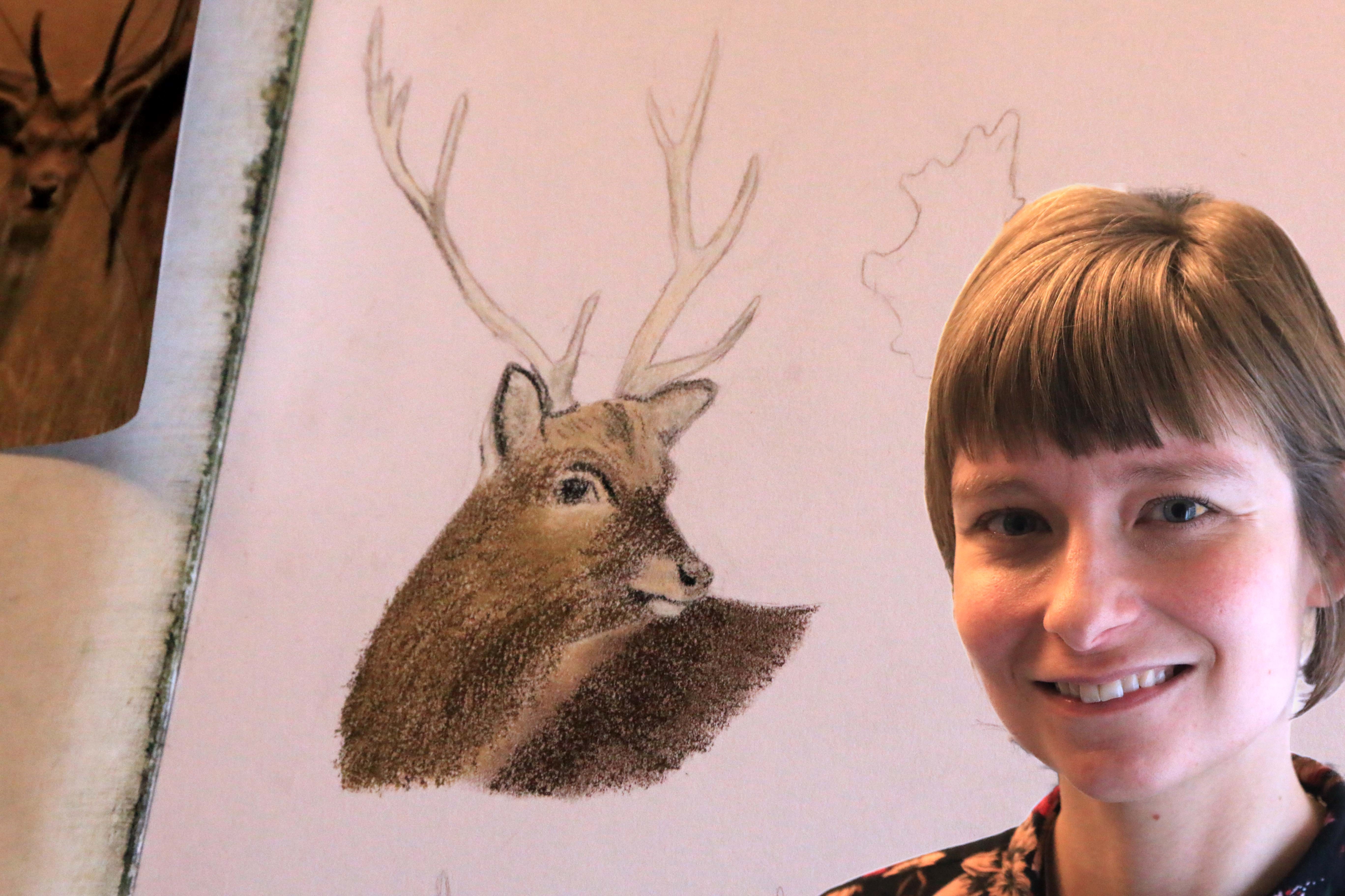 Da RYK IND RIBE besøgte Sanne – med efternavnet Damgaard Jessen – var hun fordybet i at tegne flere hjorte i samme motiv. Det kræver en sikker hånd – orden og systematik, når man vil opbygge et kridtbillede i flere lag – og dertil en god portion tålmodighed.