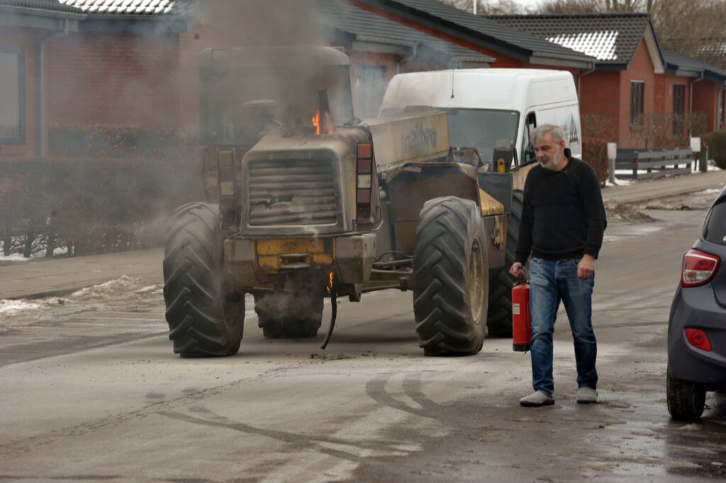 På trods af, at en selvkørende læssemaskine, en såkaldt Manitu, mandag middag trak en hale af røg efter sig helt fra midt på Nørremarksvej til Seminarievej 58, var det først her, føreren af maskinen opdagede, at det brændte.