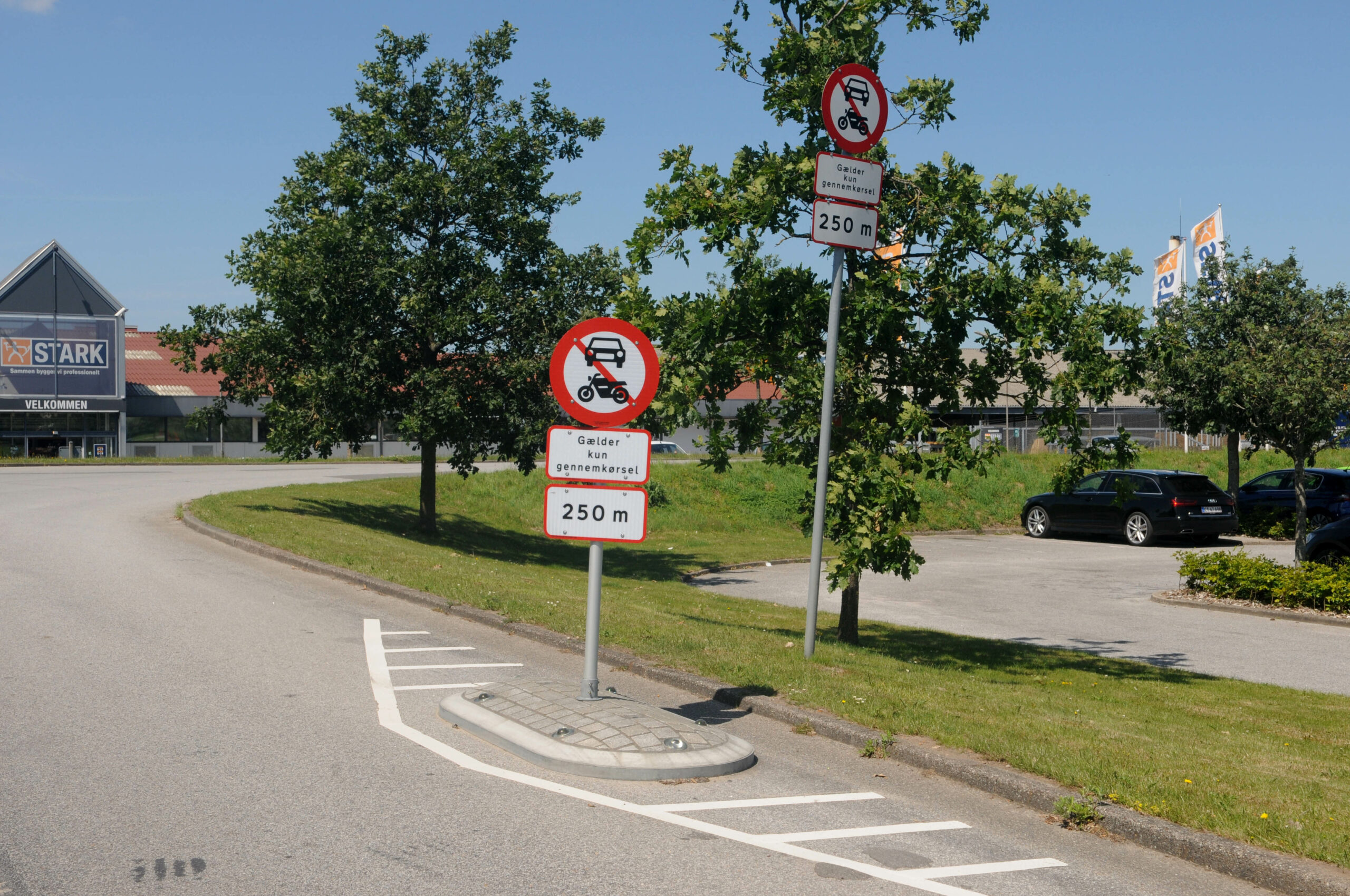 En skiltning på en chikane – og samme skilte højt på stander i vejkanten. Mon det giver mening at sige det samme to gange – på dansk?