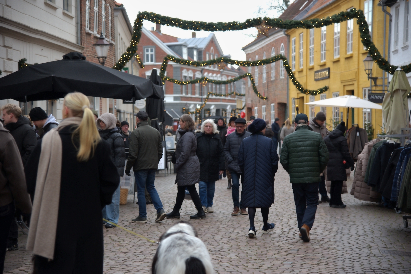 Videre hen ad gågaden fortsatte den skønne stemning. Her var der også stor trængsel og glade, tålmodige mennesker, der smilende gav hinanden plads i det usædvanligt smukt julepyntede strøg.